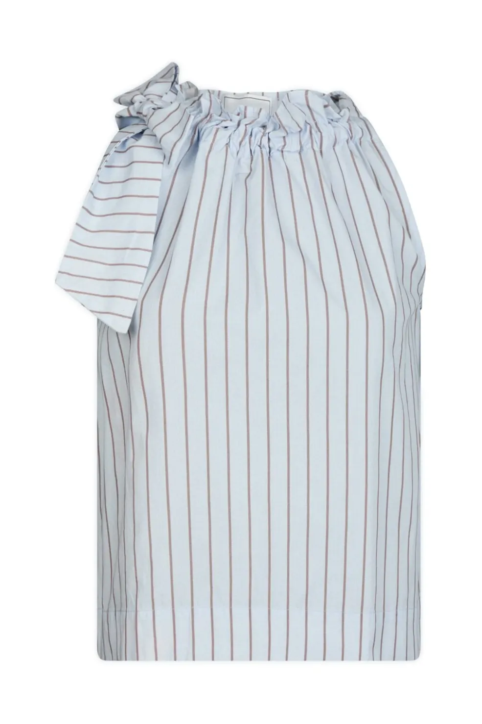 Stribet top fra Neo Noir i lyseblå med brune striber. Toppen har en halterneck med bindebånd og en sløjfedetalje på skulderen.
