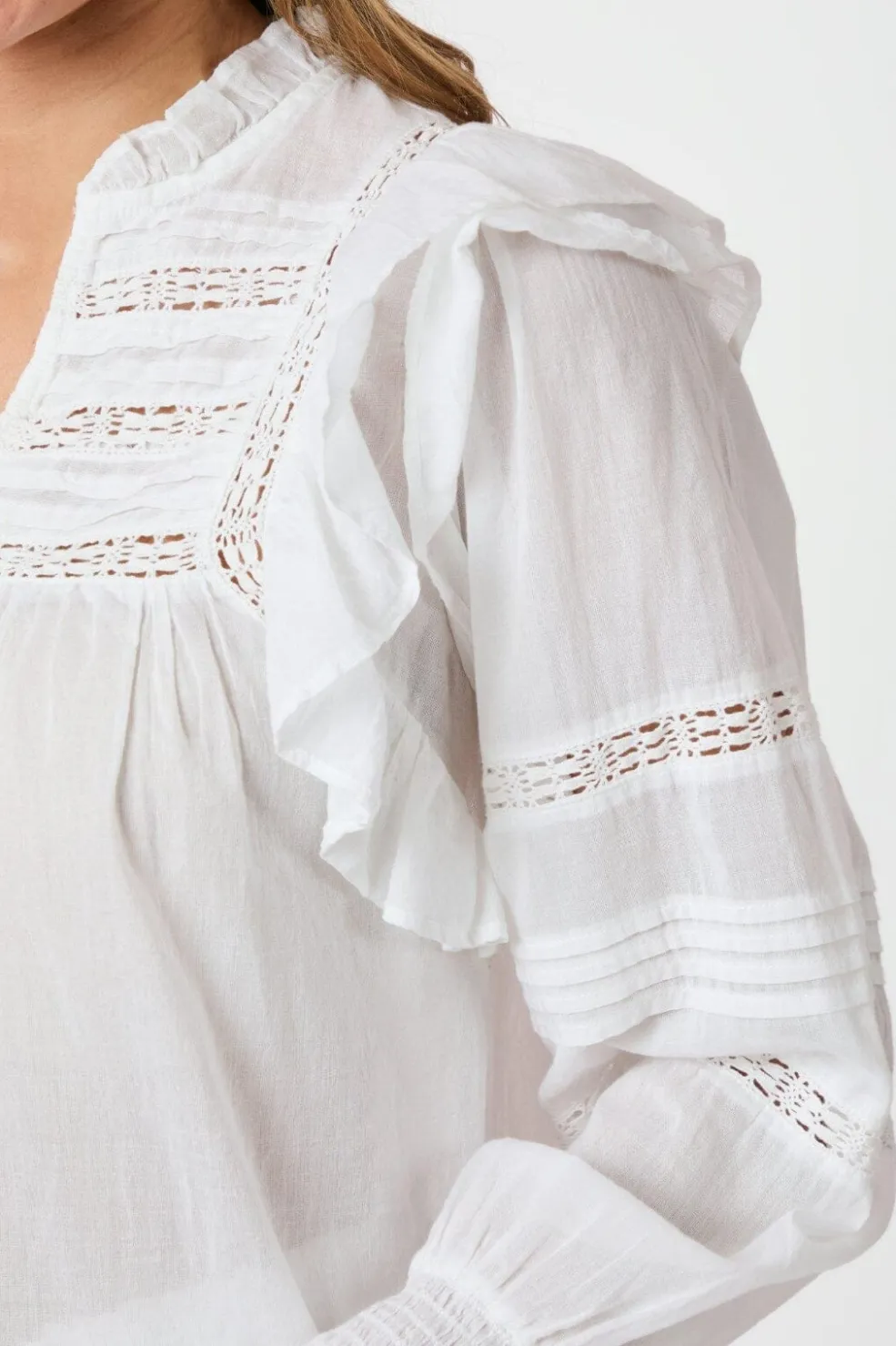 Hvid bluse fra Neo Noir i let bomuldsvoile. Blusen har rynkede detaljer ved v-udskæringen og horisontale blondeindsatser over brystet og ærmerne.