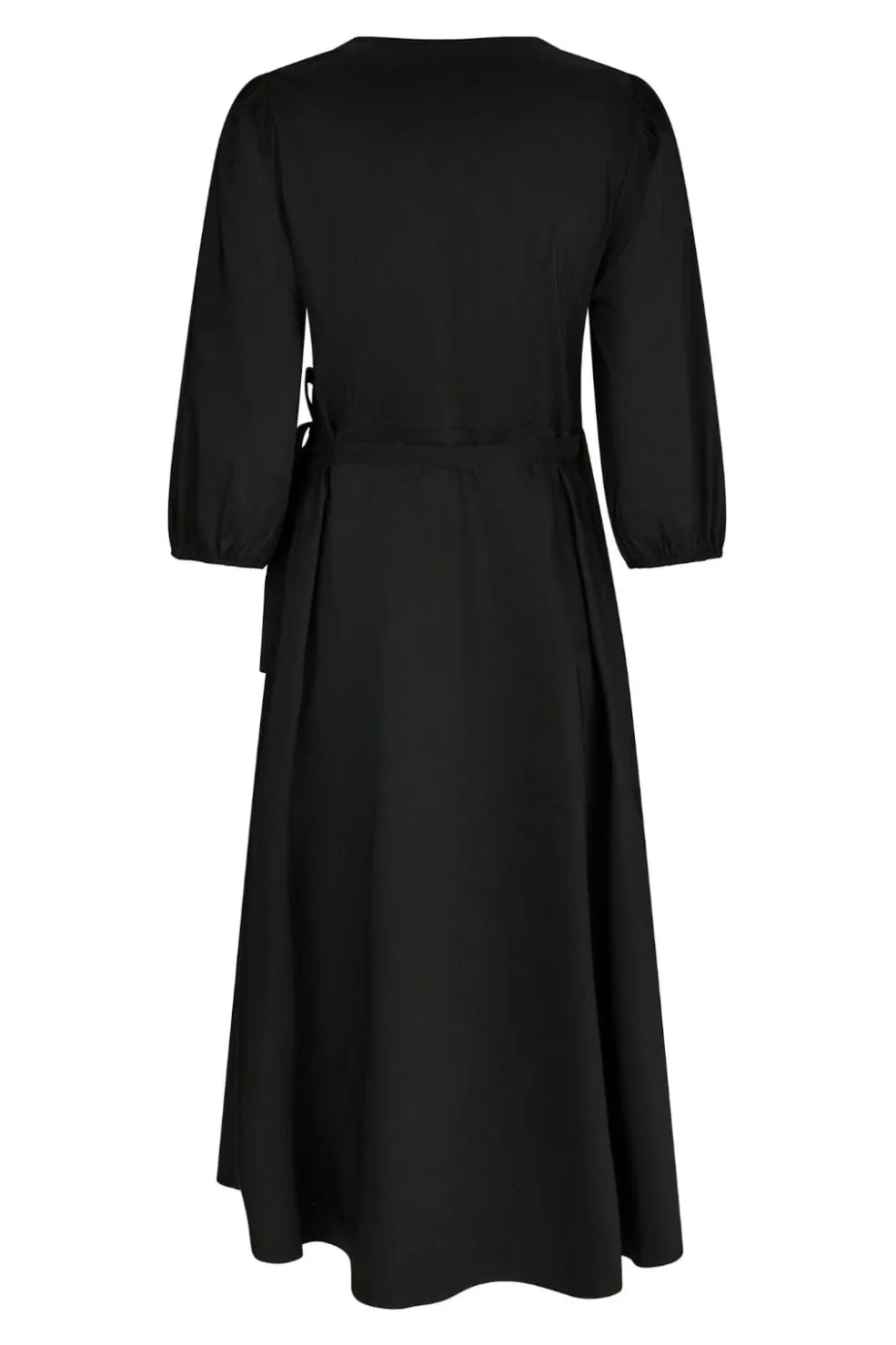 Sort poplin-kjole fra Neo Noir med slå-om-design og V-hals. Kjolen har rynkedetaljer ved udskæringen og et bindebånd i taljen.