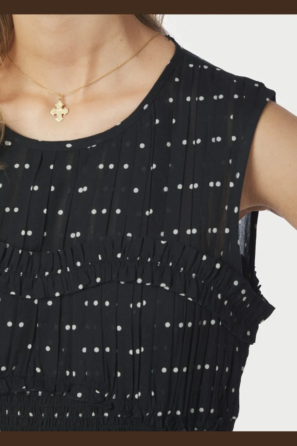 Sort kjole fra Neo Noir med hvidt prikket mønster. Kjolen er lang og ærmeløs med flæsedetaljer og en elastisk talje.