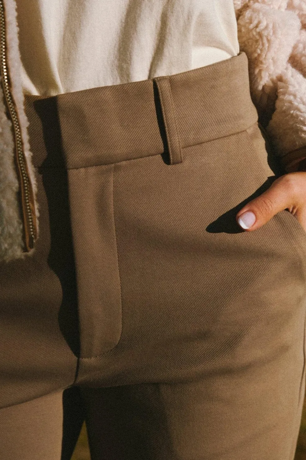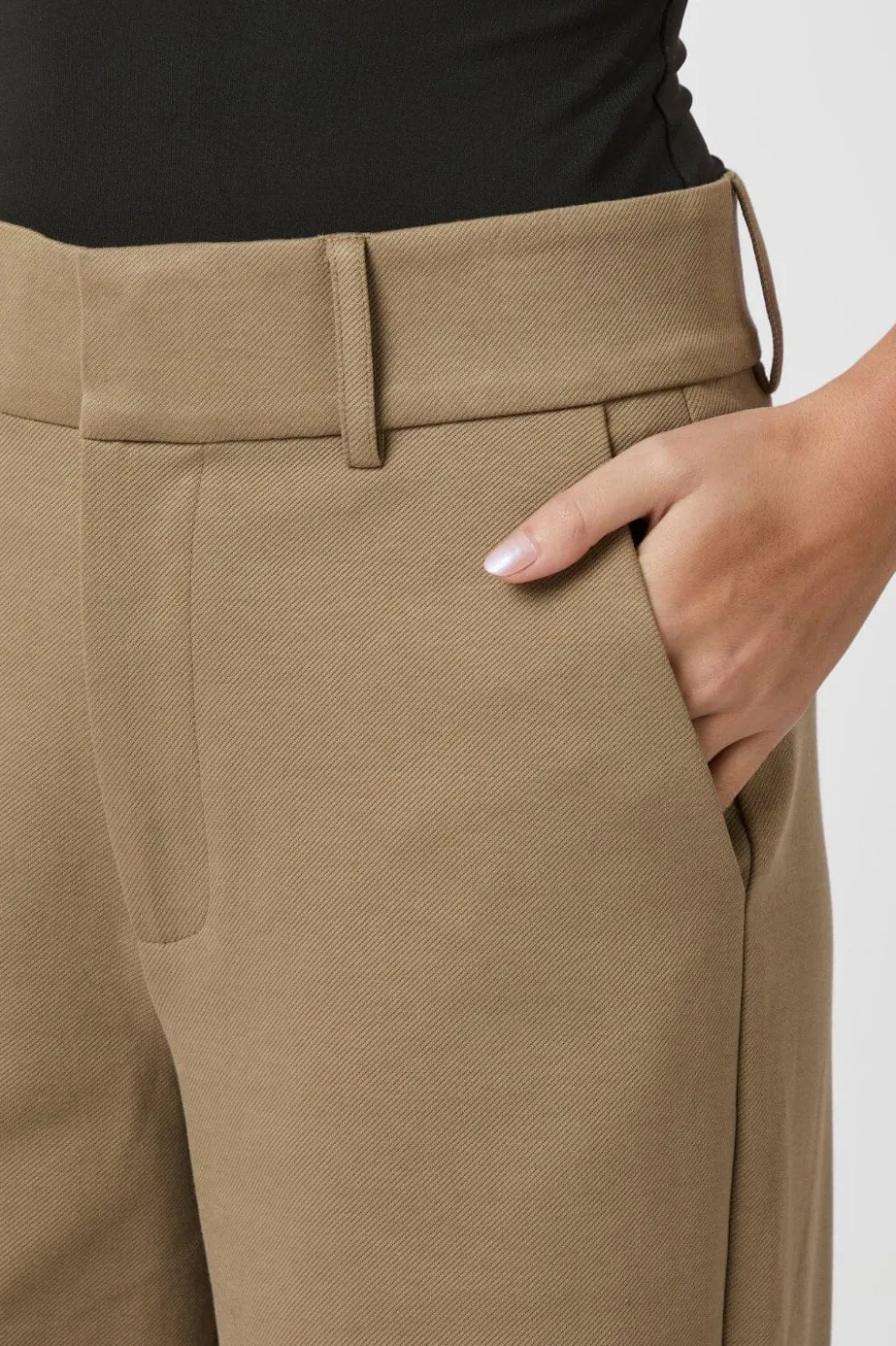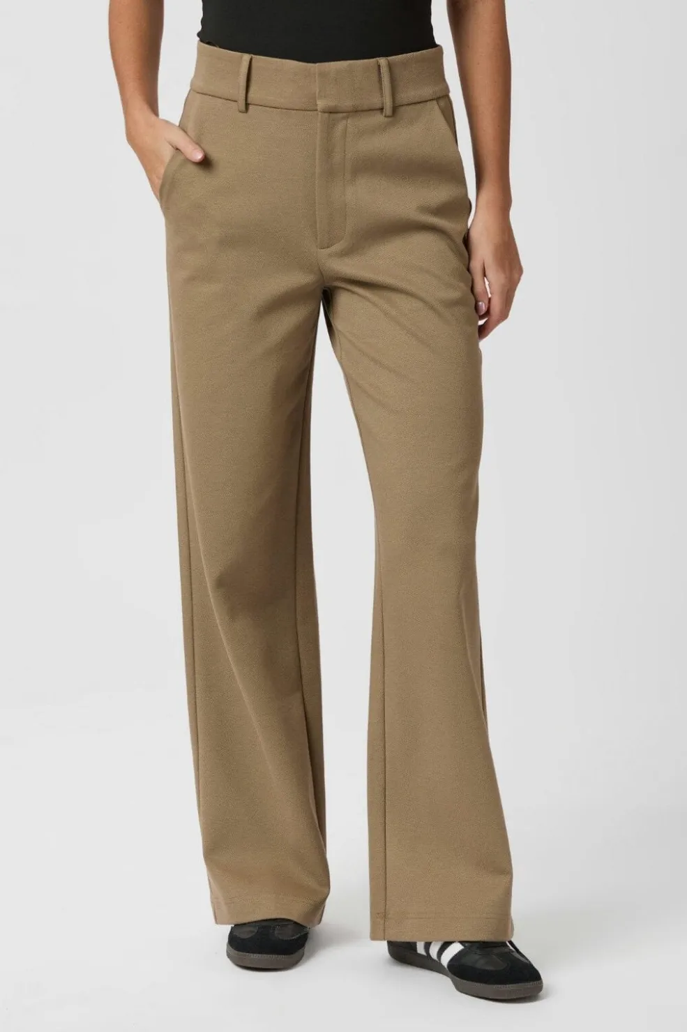 Gulvlange bukser fra Neo Noir i taupe. En højtaljet model med løs pasform og vidde i benene. Materialet er strækbart og har en let struktur.