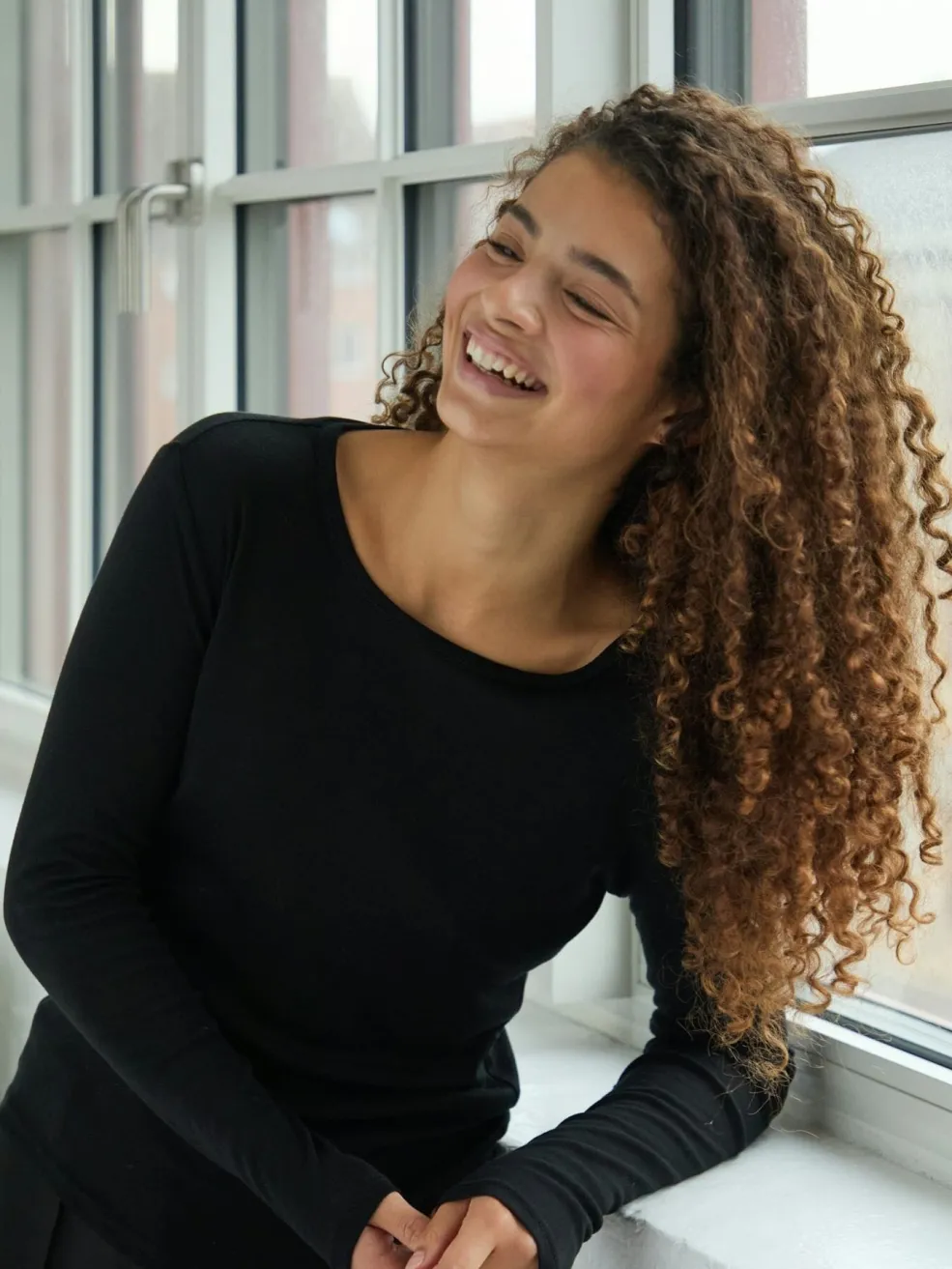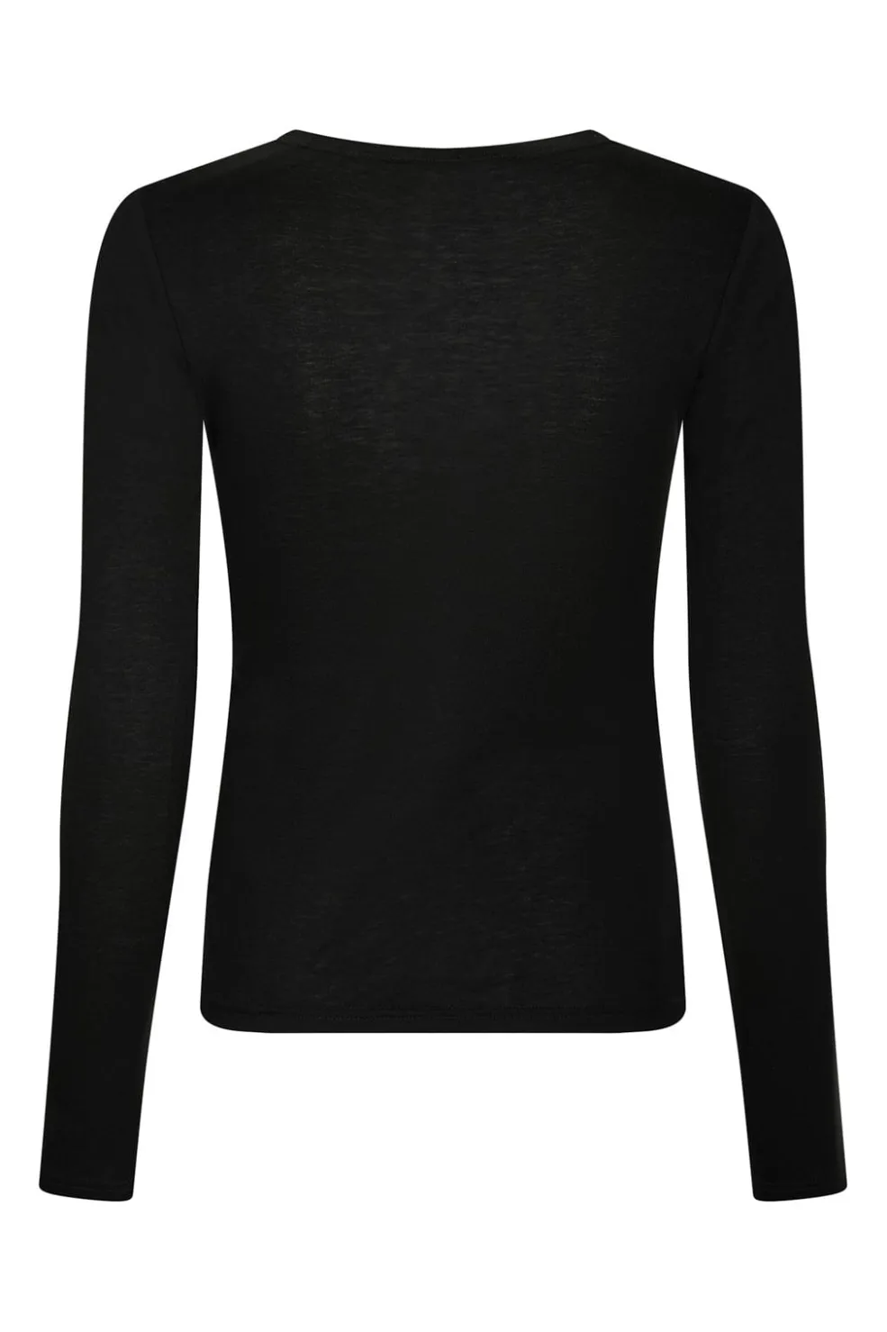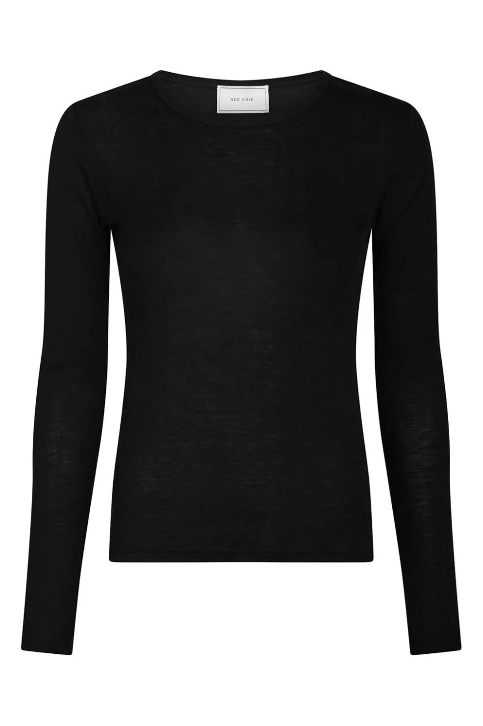 Sort ribbluse fra Neo Noir i en blød blanding af lyocell og uld. Blusen har en tætsiddende pasform med lange ærmer og rund halsudskæring.