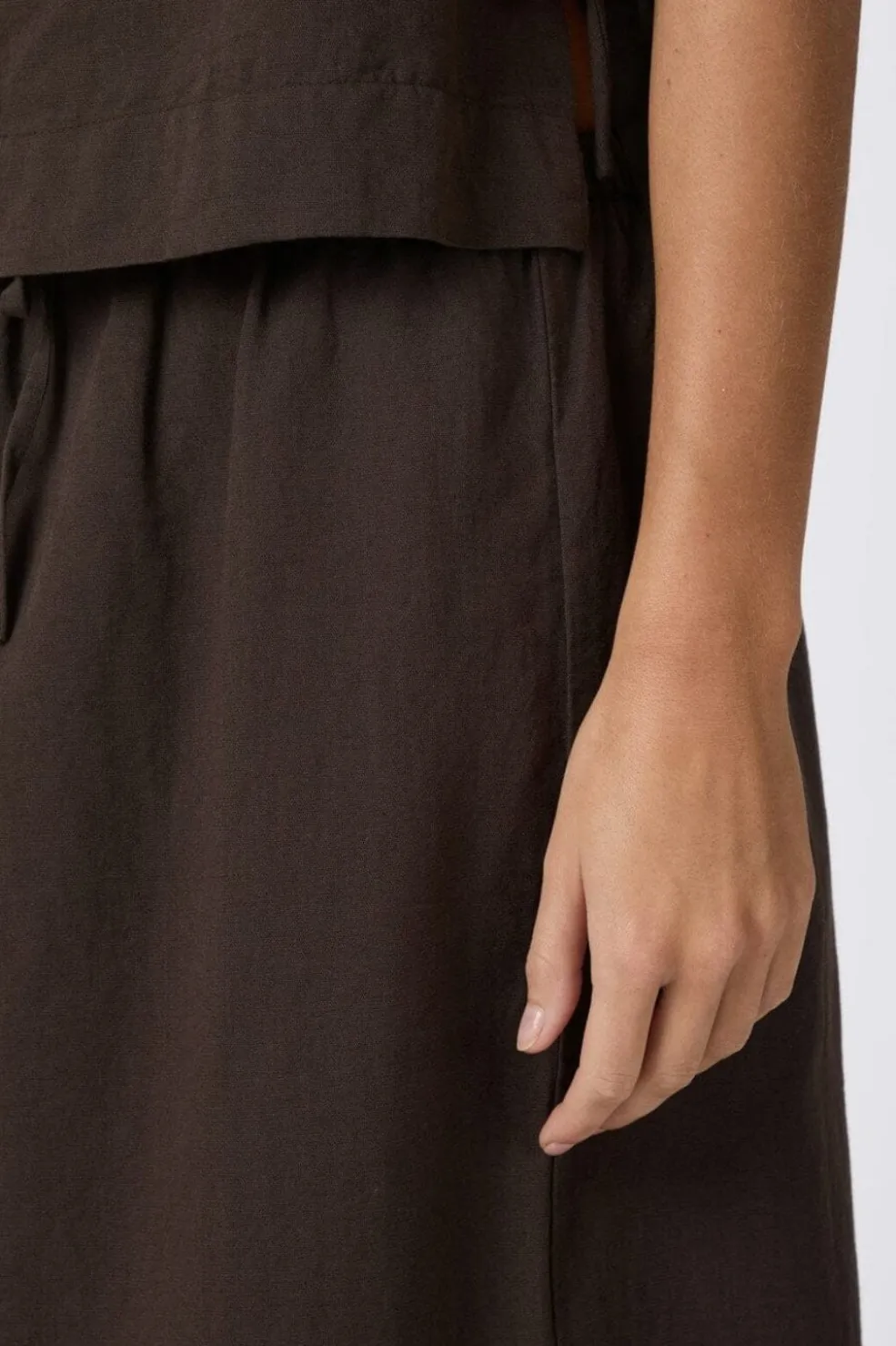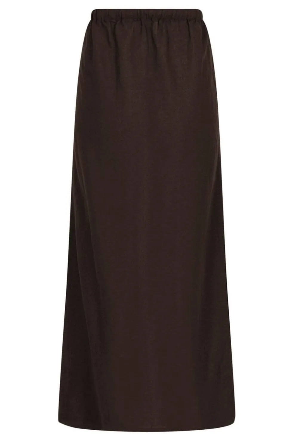 Mørkebrun nederdel fra Neo Noir i en blanding af bomuld og hør. Nederdelen har snørebånd og elastik i taljen samt sideslids.