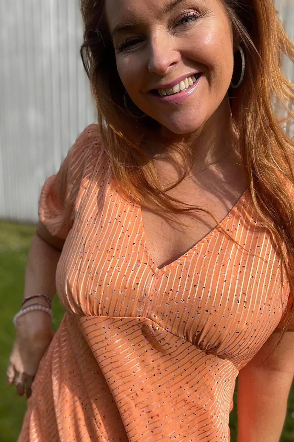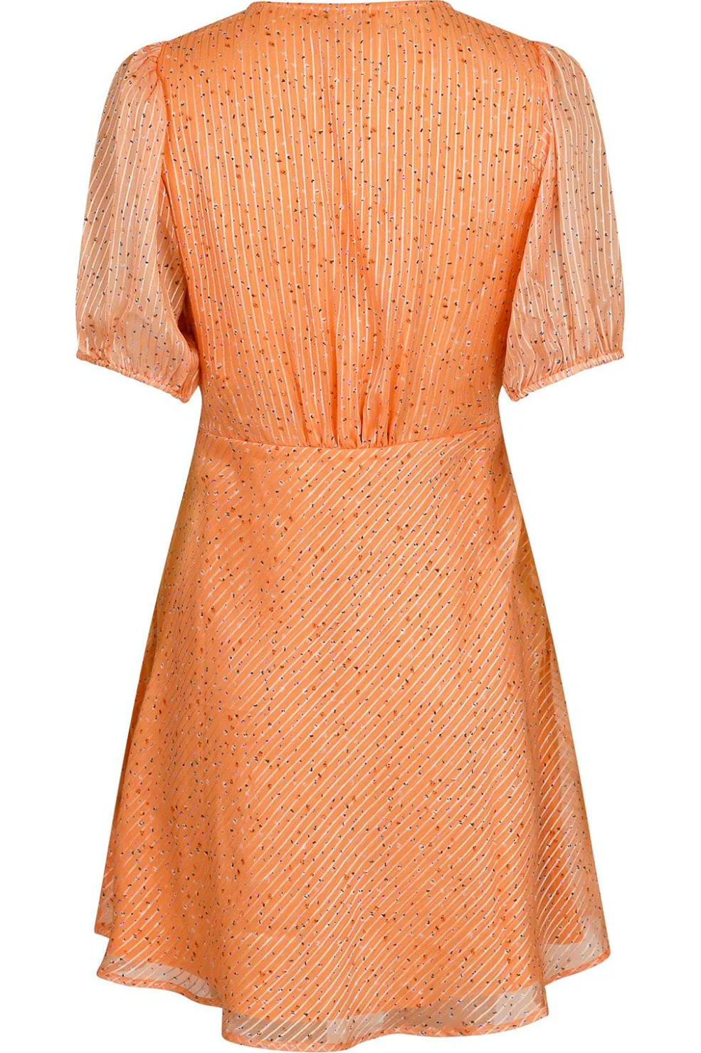 Rigtig fin kjole i orange med farverige pletter fra Neo Noir. Der er V-udskæring foran og korte ærmer. Kjolen skærer ved brystet. Der er underkjole i undtagen ved ærmerne hvor den er let gennemsigtige.
