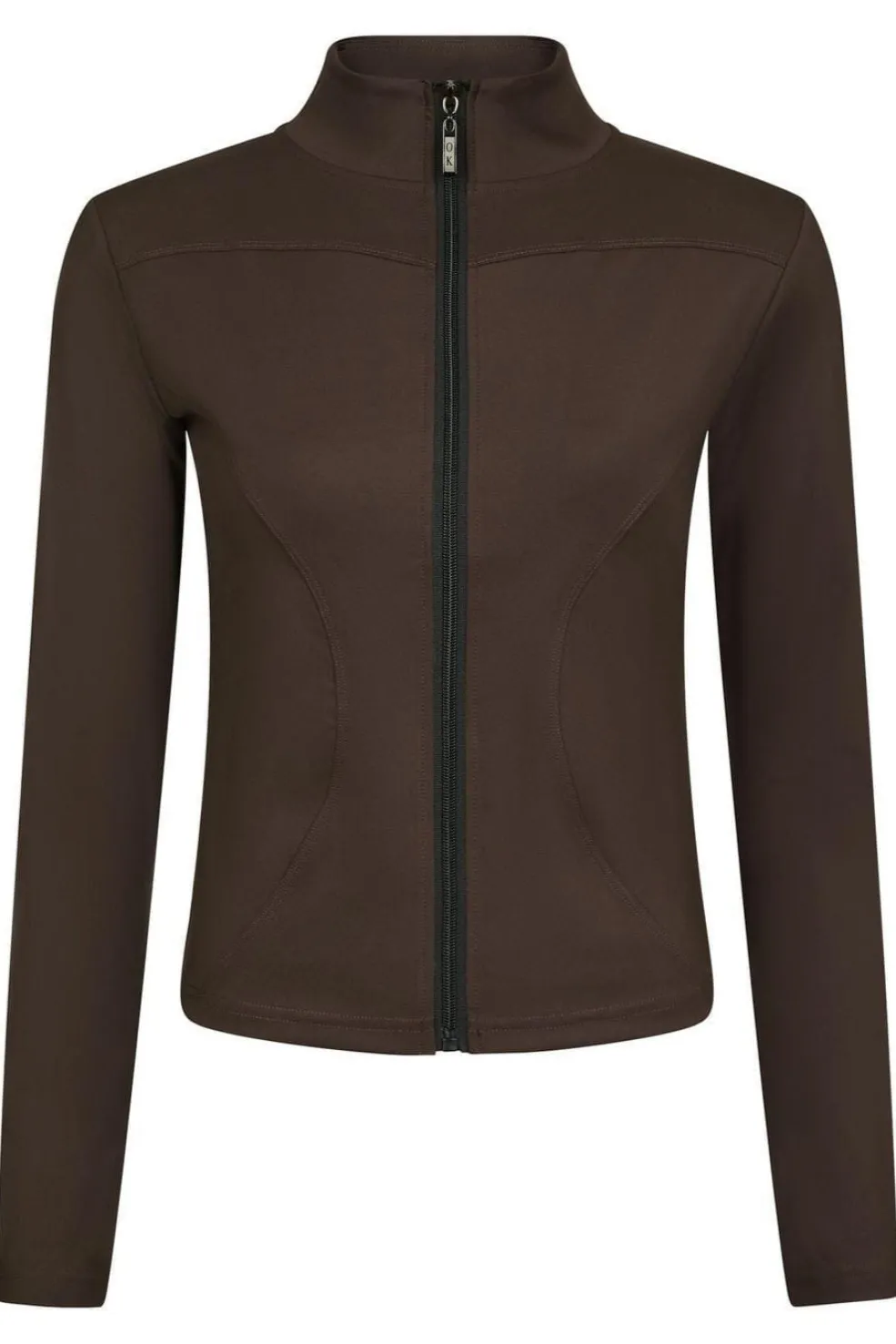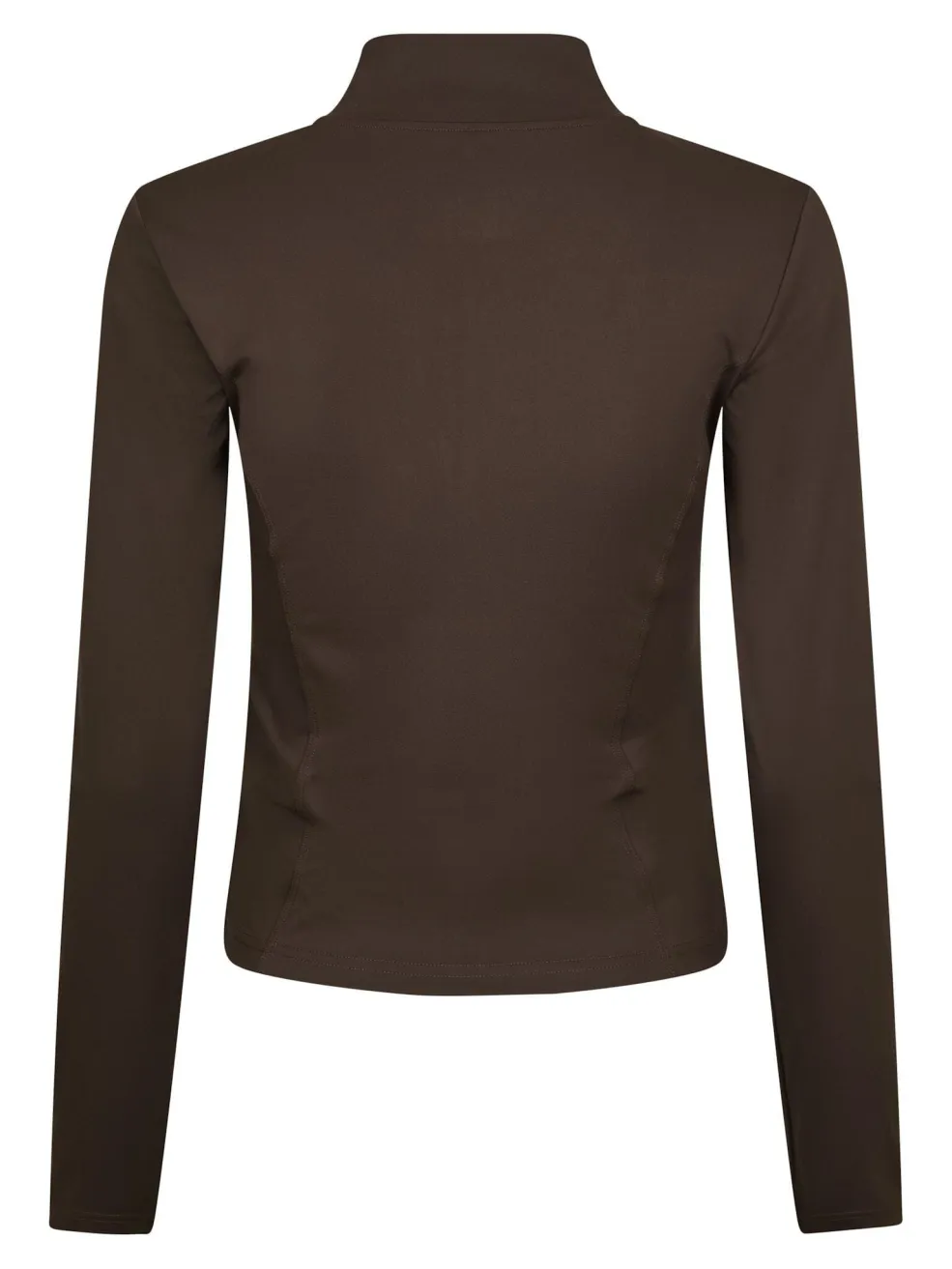 Bluse fra Neo Noir i mørkebrun. Den har høj krave, gennemgående lynlås foran og lange ærmer.