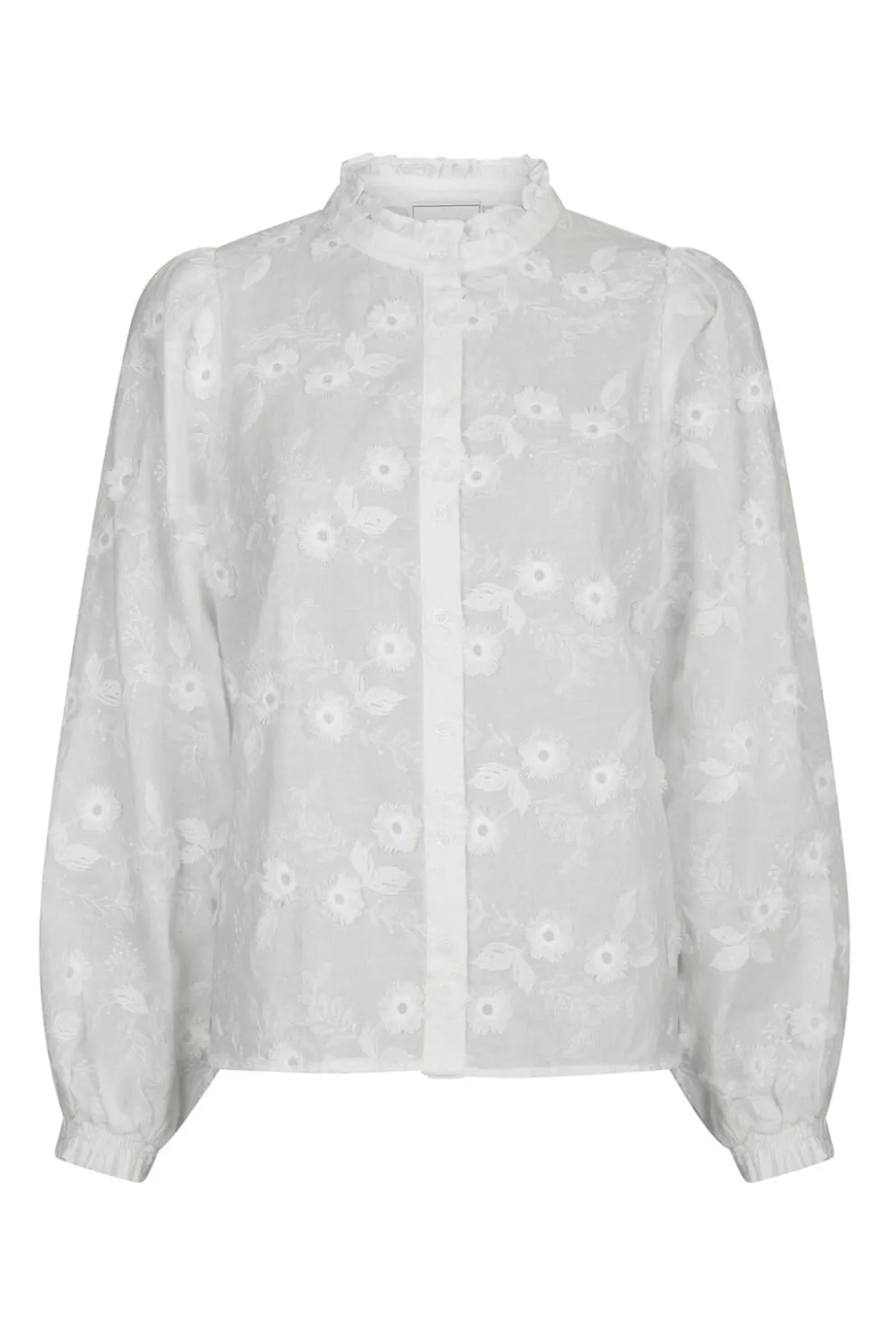 Hvid skjorte fra Neo Noir med broderet blomstermønster over hele skjorten. Skjorten har en høj hals med flæsekant og lange ærmer med elastiske manchetter.