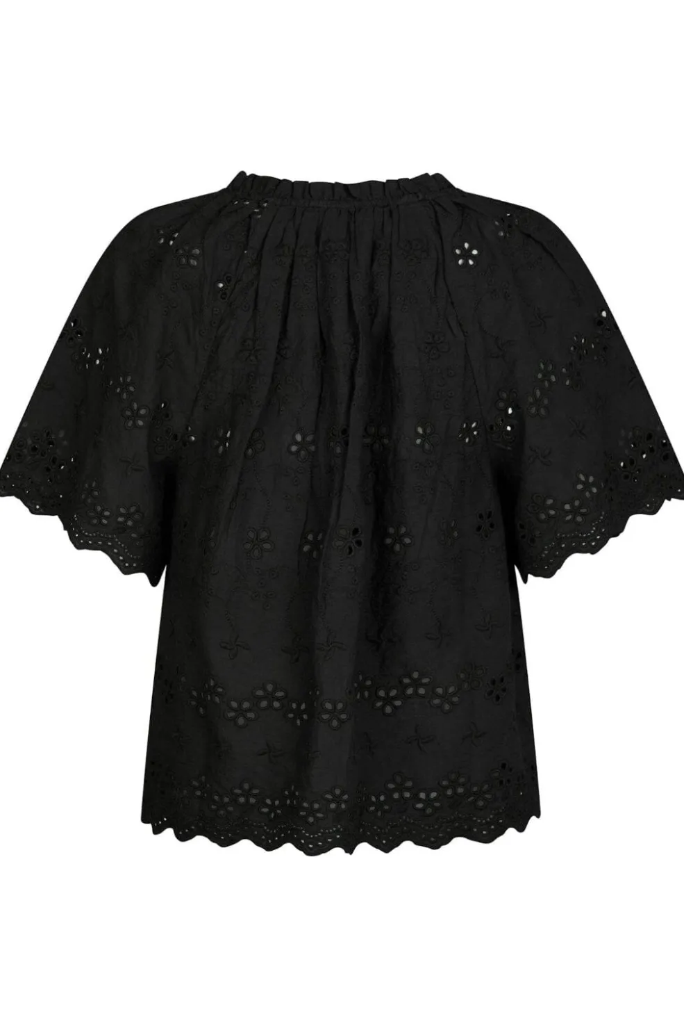 Sort bluse fra Neo Noir med blomsterbroderi og flæsekanter. Blusen har v-halsudskæring og korte ærmer med bølgede kanter. Bindebåndet foran giver mulighed for at justere pasformen.