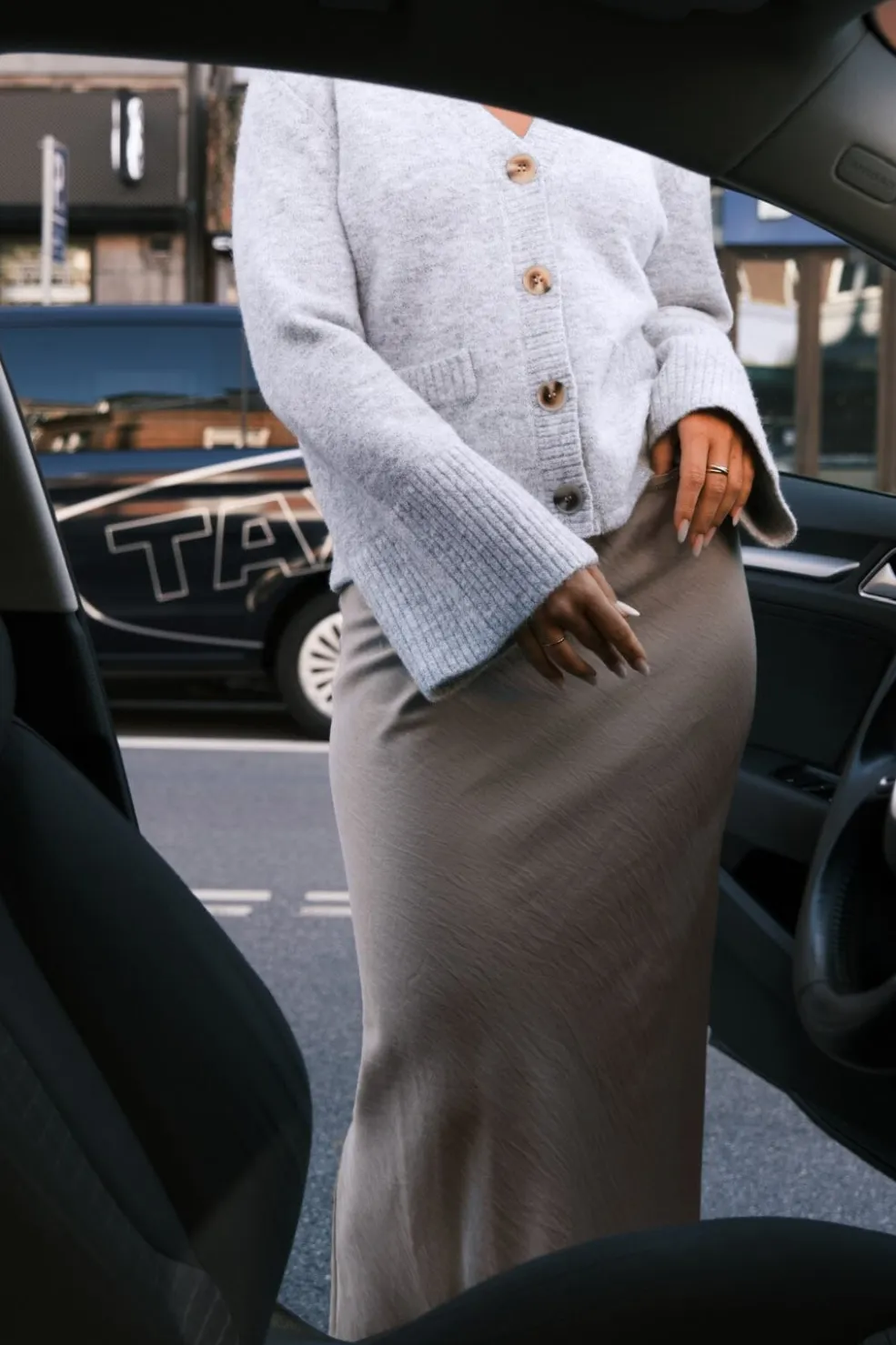 - Modellen er 176 cm høj og bærer størrelse 36