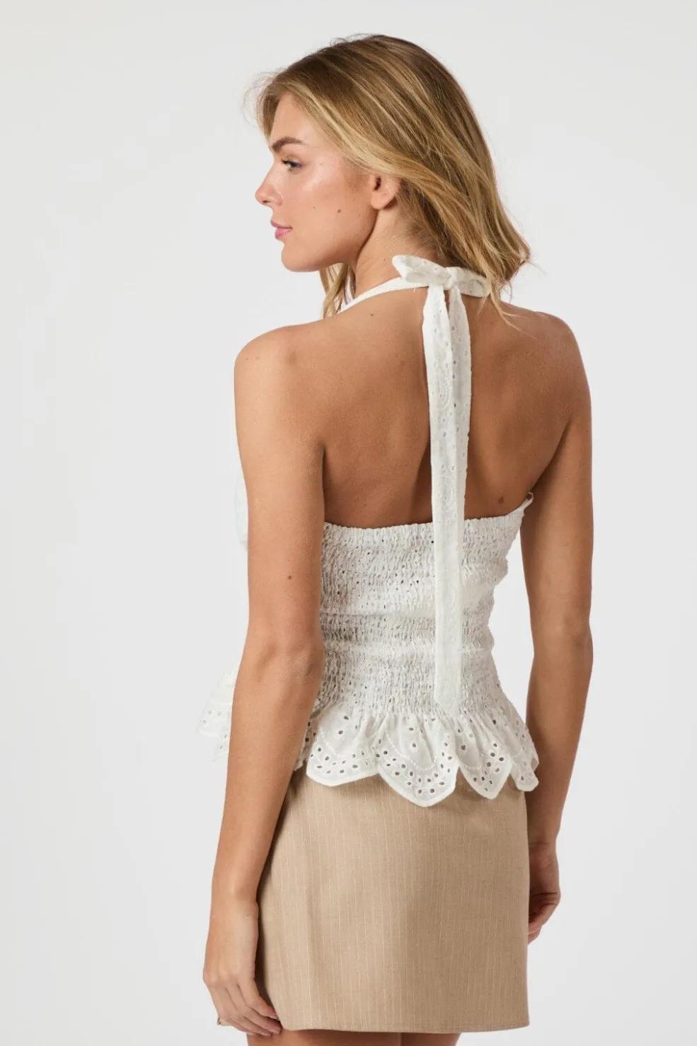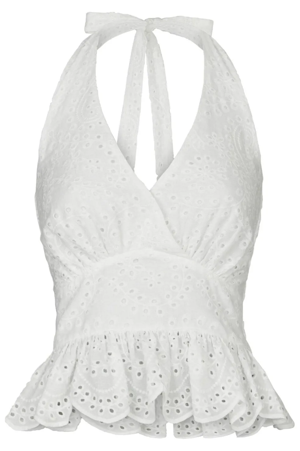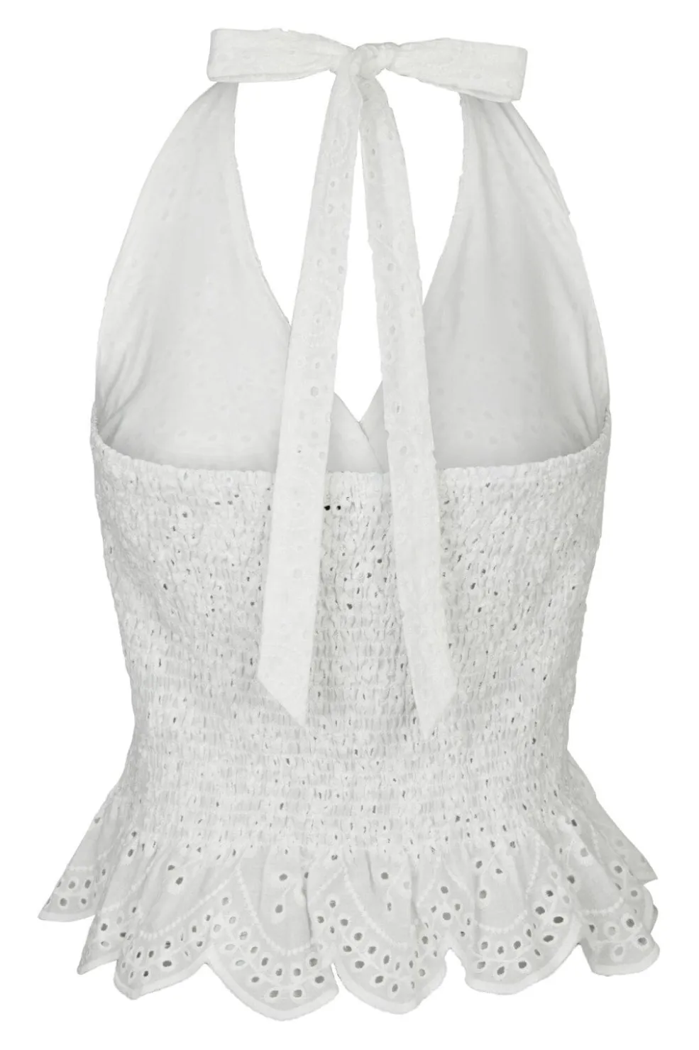Hvid halterneck-top fra Neo Noir i broderi anglaise-kvalitet. Toppen har bindebånd i nakken og et lille skørt forneden med flæsekant. Smock ved taljen giver en god pasform.