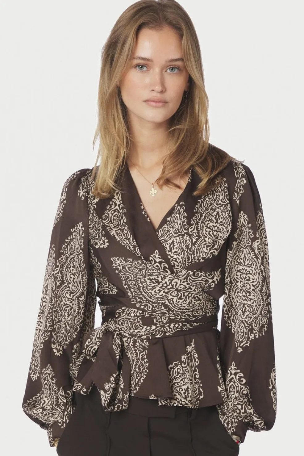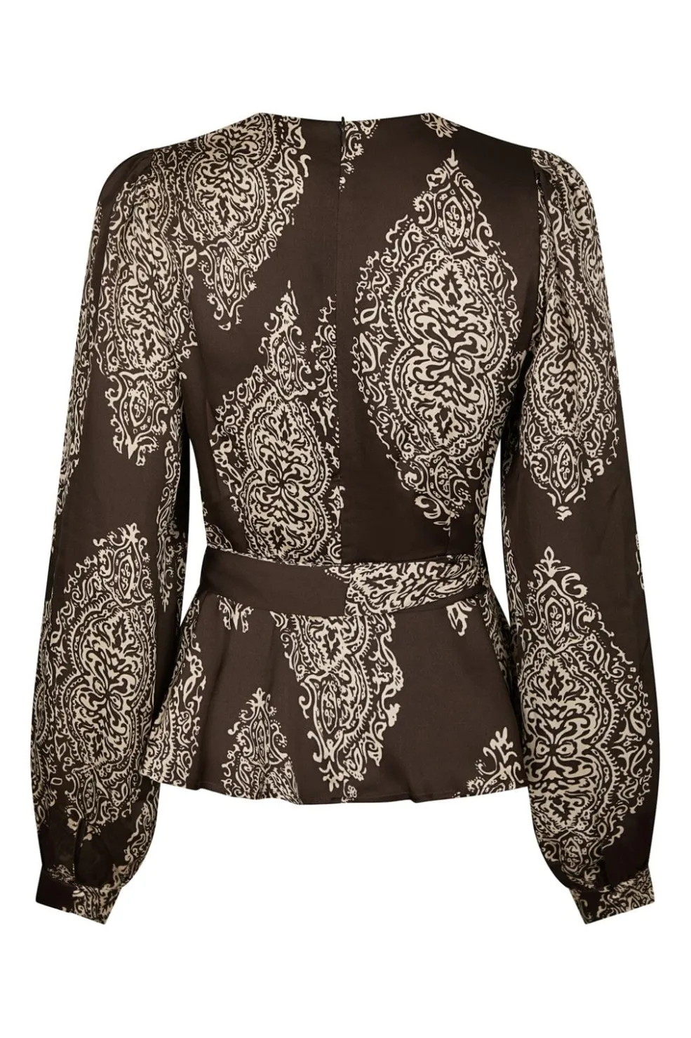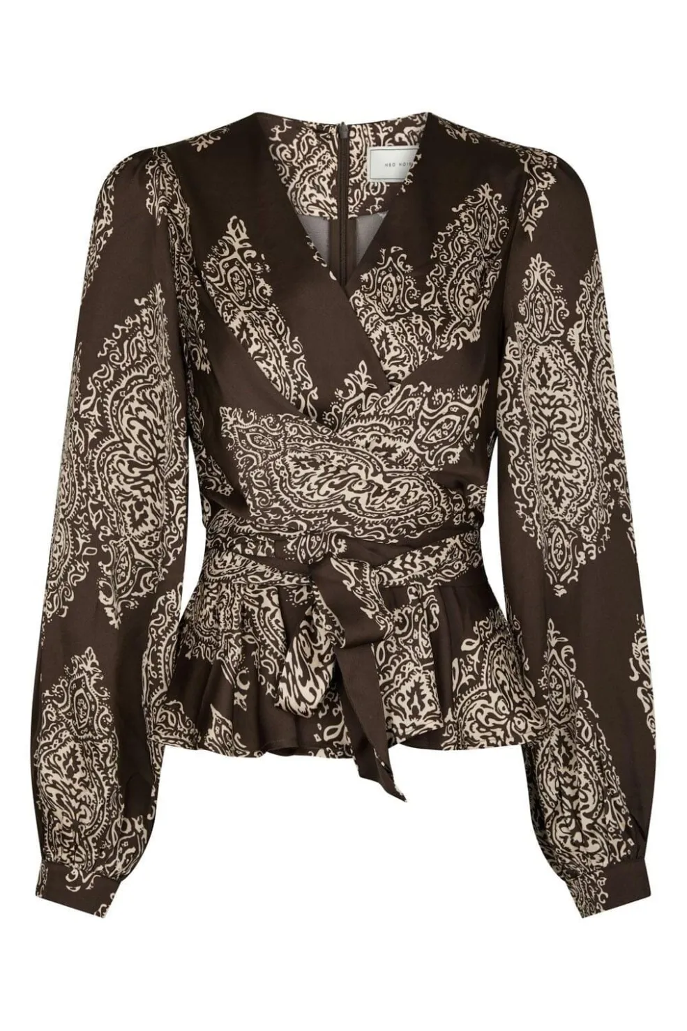 Mørkebrun bluse fra Neo Noir med et kontrasterende paisley-print. Blusen har bindebånd, flæser og en v-hals med lynlås og snøre.