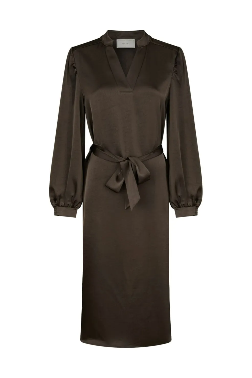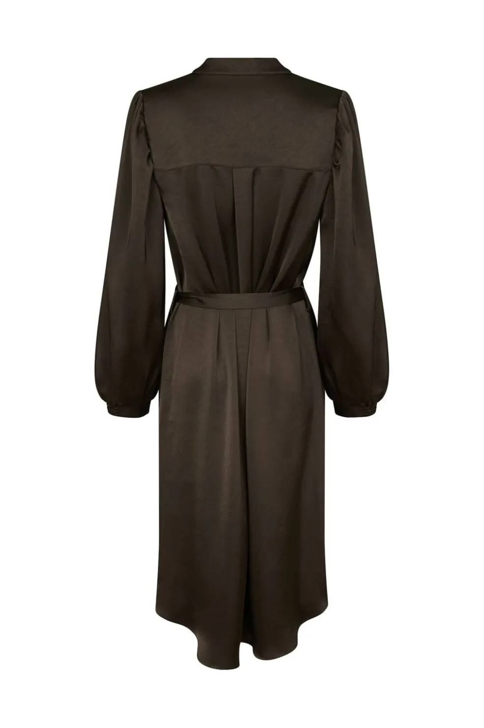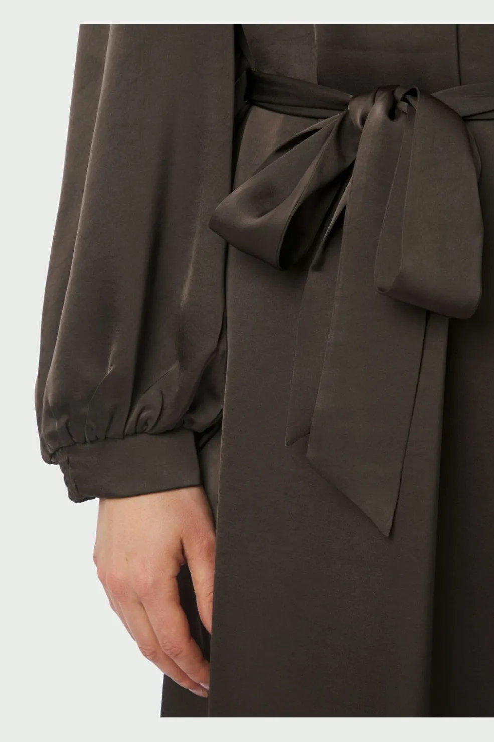 Mørkebrun satinkjole fra Neo Noir med lange ærmer og manchetter. Kjolen har en V-halsudskæring og et bindebælte i taljen, der kan justeres efter ønske.