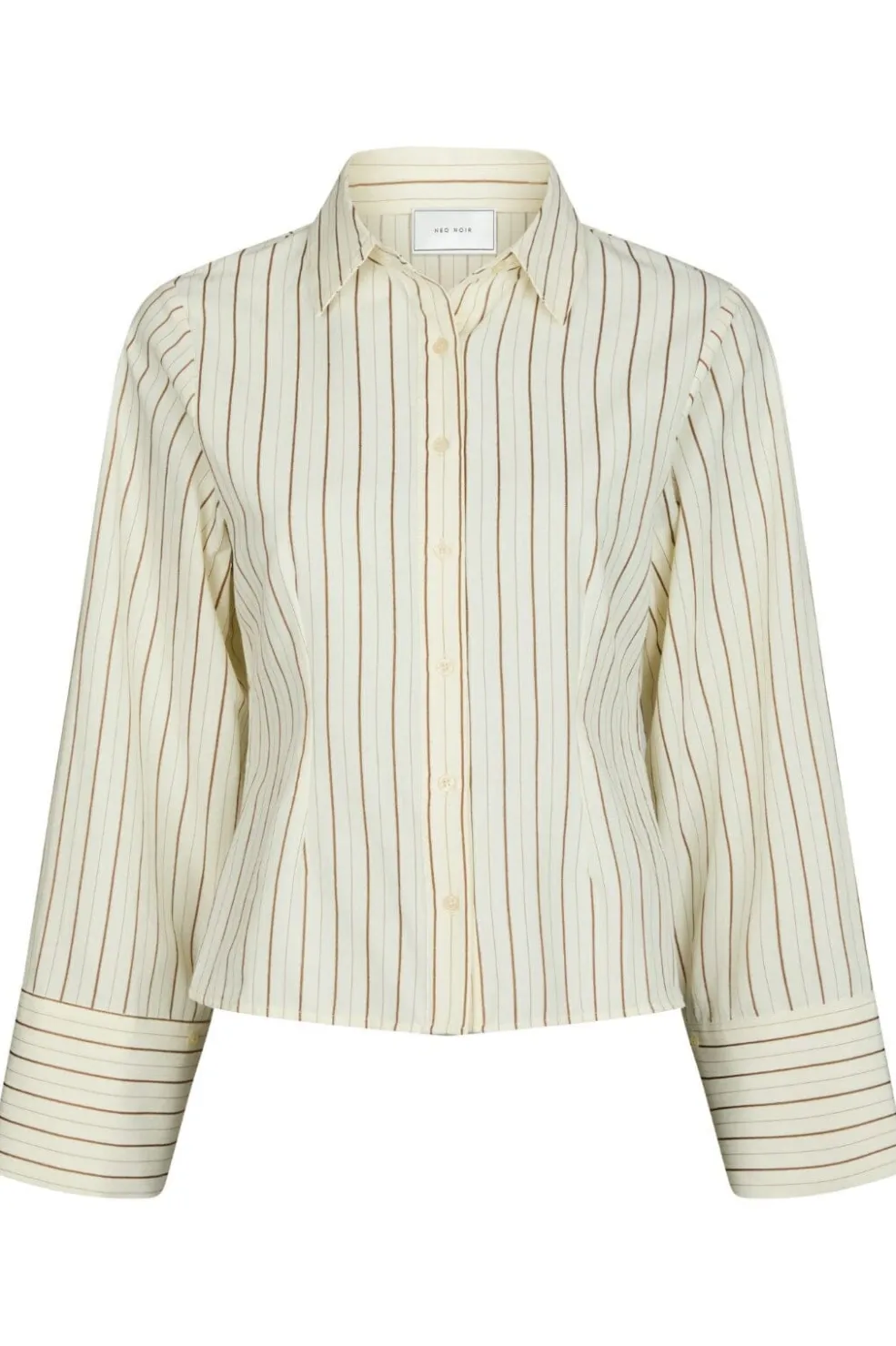 Sandfarvet skjorte fra Neo Noir med striber. Skjorten har en klassisk krave, knaplukning foran og brede ærmer med manchetter. Den er lavet af en blanding af bomuld og polyester.