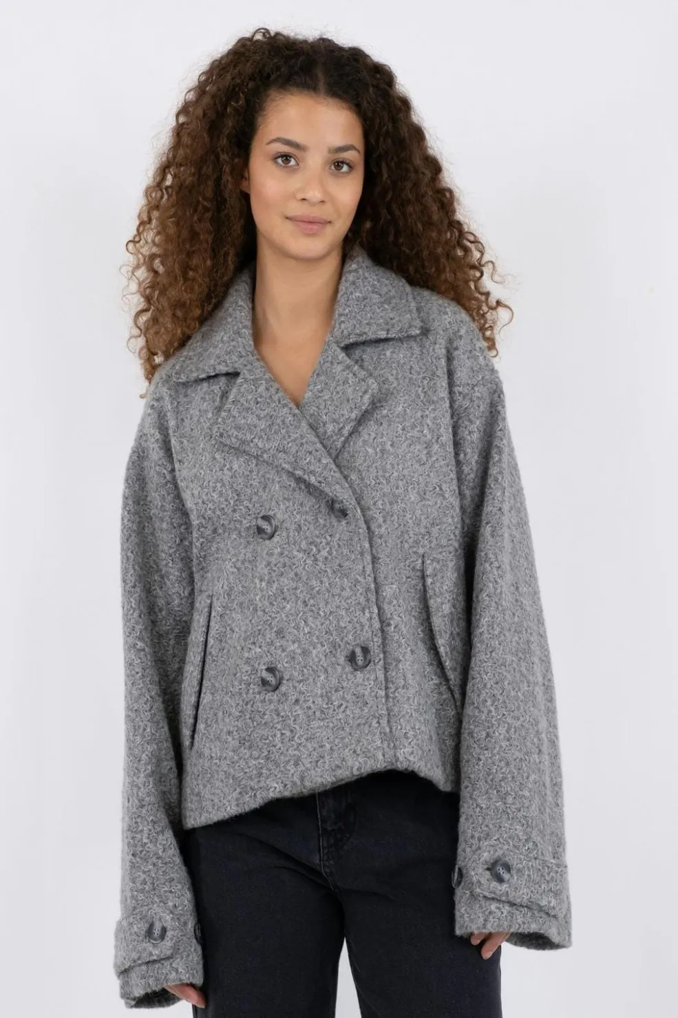 Grå jakke fra Neo Noir i meleret nylon. En kort jakke med Peter Pan-krave og dobbeltbrystet design med knapper. Den boxy silhuet giver god plads til lag-på-lag.