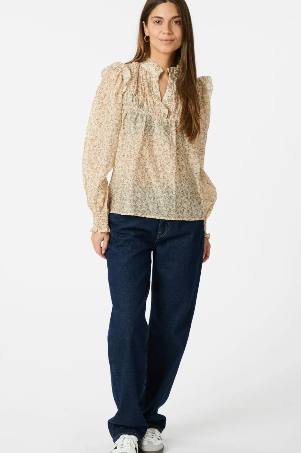 Blomstret bluse fra Neo Noir i off-white med beige nuancer. Blusen har en V-halsudskæring med flæser ved skuldrene og lange ærmer med smockdetaljer ved manchetterne.