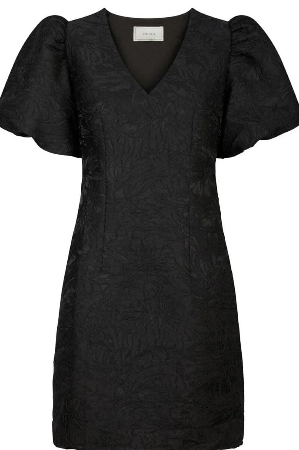 Sort kjole fra Neo Noir i brokademønstret stof. Kjolen har puffede ærmer og en V-udskæring, der gør den velegnet til formelle anledninger.