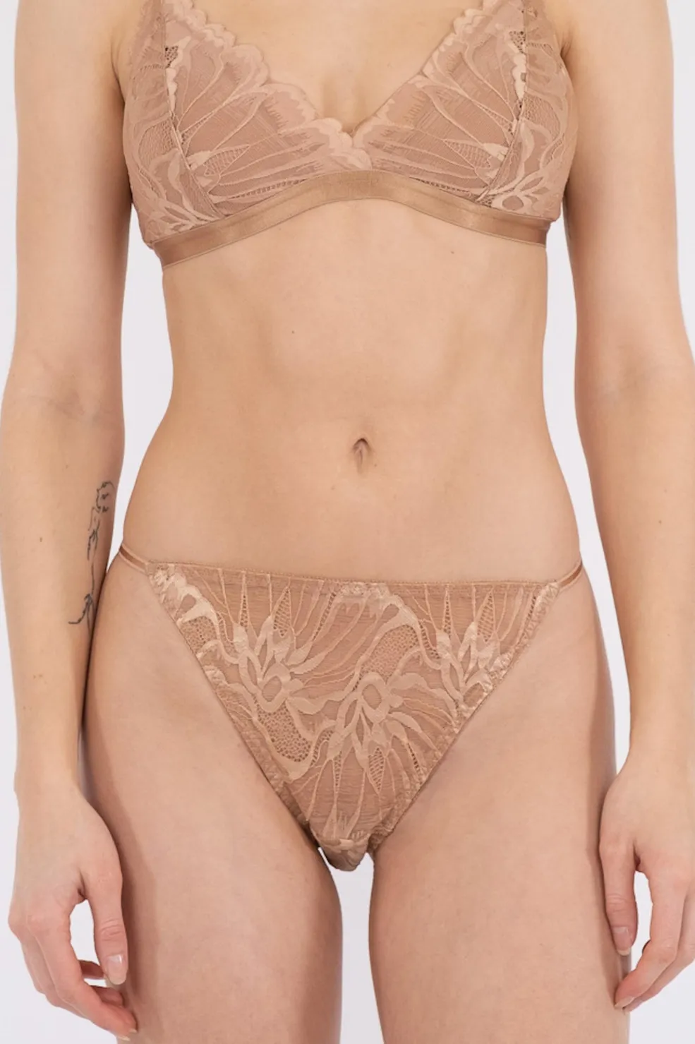 Trekants-BH fra Neo Noir i toffee-farvet nuance. Den har blød padding og er udsmykket med blomstret blonde, der dækker hele skålen.