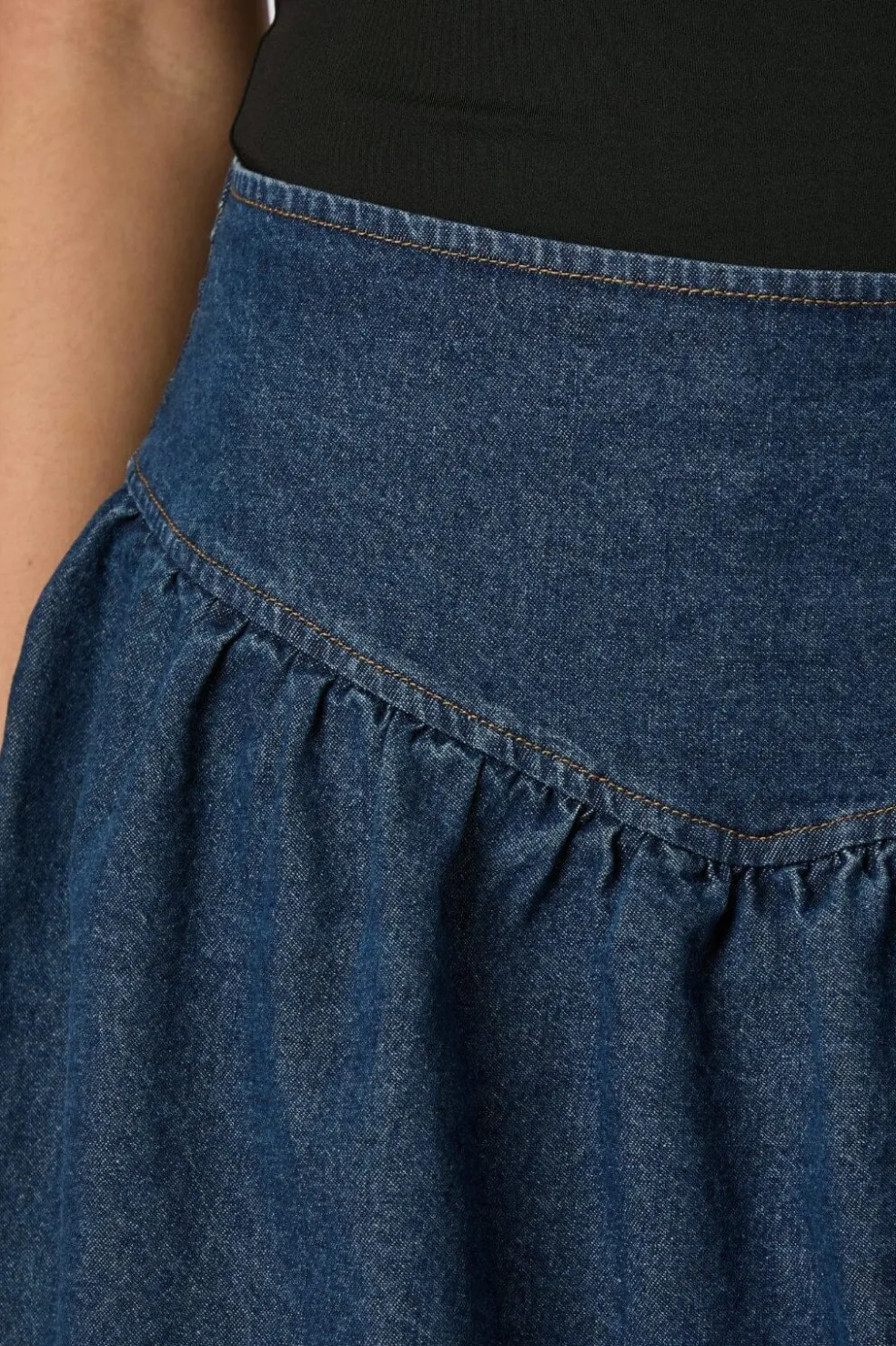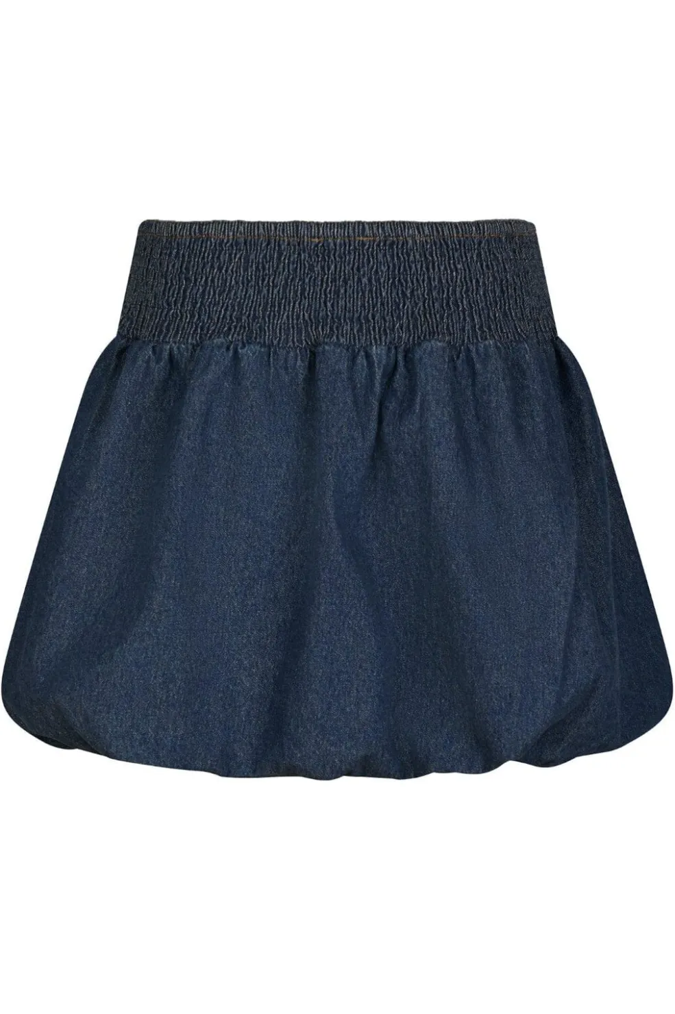 Denimskørt fra Neo Noir med ballonform og dekorative syninger. Den bløde denim har en klassisk blå farve. Skørtet har elastik i taljen og en vid nederdel med rynkeeffekt.