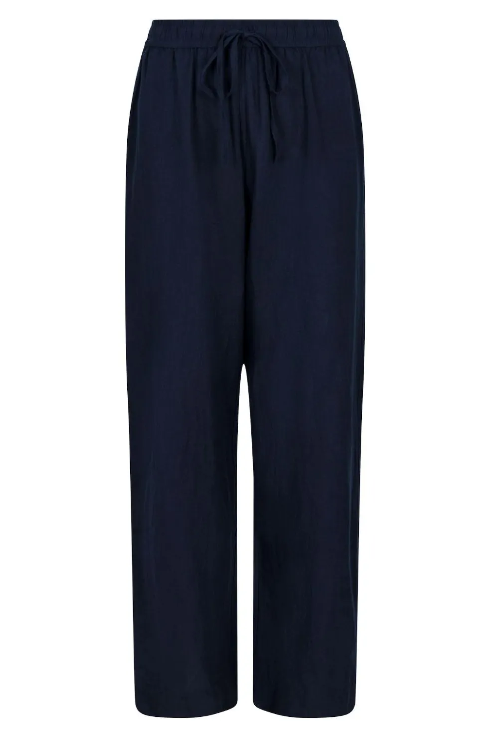 Mørkeblå bukser fra Neo Noir i en blanding af bomuld og hør. Bukserne har brede ben med en løs pasform og elastik med bindebånd i taljen.