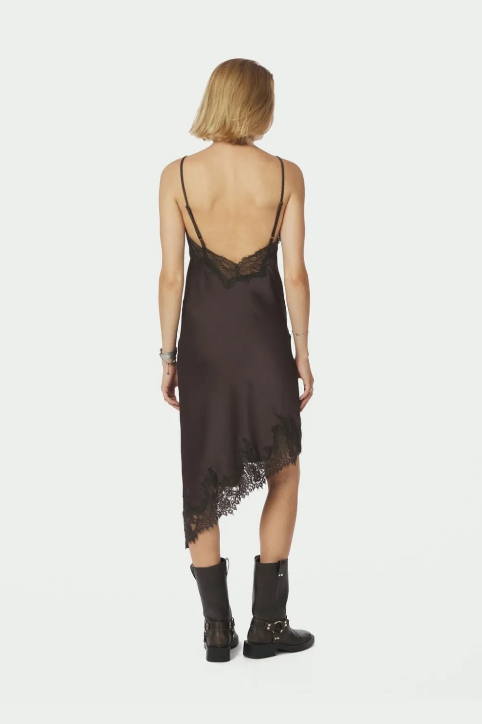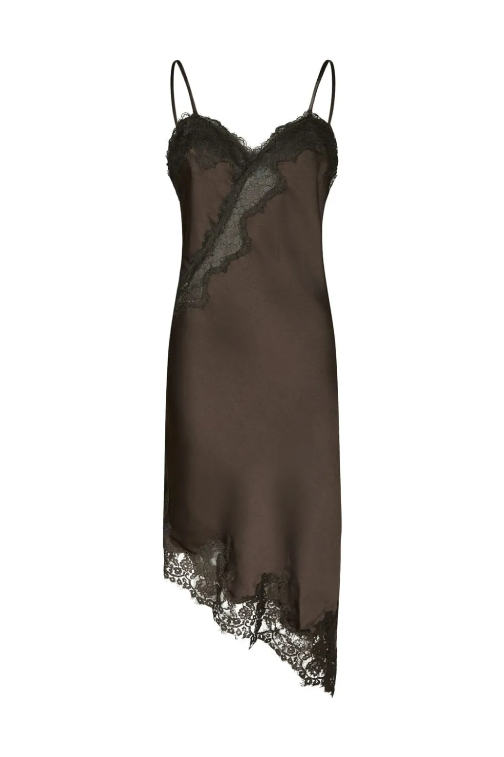 Mørkebrun kjole fra Neo Noir med tynde stropper og asymmetrisk blondekant. Kjolen har en V-udskæring og blonder ved brystpartiet.