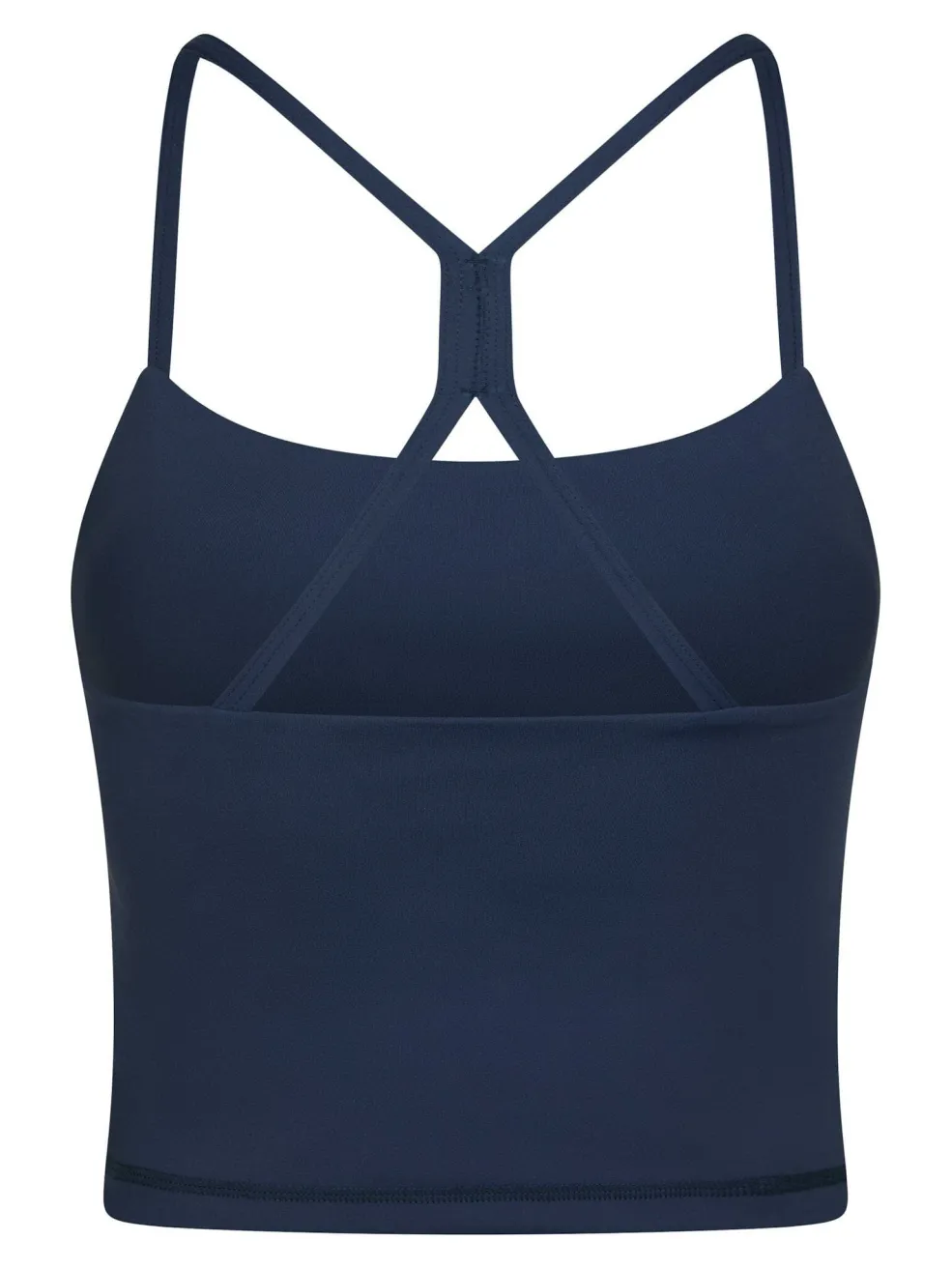 Mørkeblå top fra Neo Noir med tynde stropper og racerback-design. Materialet er 75% nylon og 25% elastan, hvilket giver toppen en strækbar pasform.