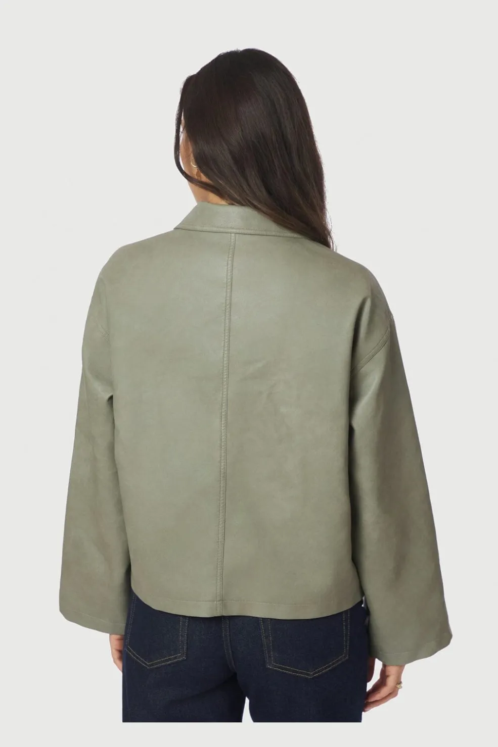 Faux læderjakke fra Neo Noir i blød grøn nuance. Jakken har en oversize pasform med skjortekrave og lynlås foran. To store lommer med klap på forsiden giver jakken et praktisk design.