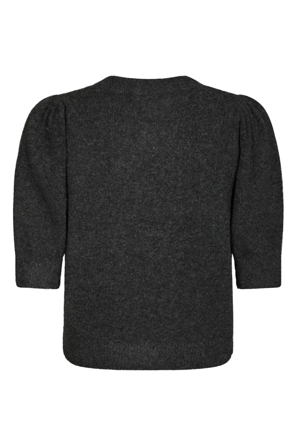 Strikket cardigan fra Neo Noir i antracit melange. Den har korte pufærmer og rund hals med en række små pailletknapper foran, der giver et diskret pift.
