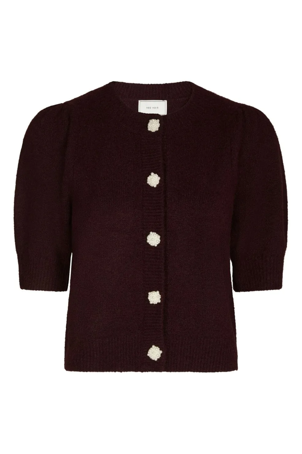 Vinrød cardigan fra Neo Noir med korte pufærmer. Cardiganen har rund halsudskæring og perleknapper foran, der giver et fint præg på den ensfarvede strik.