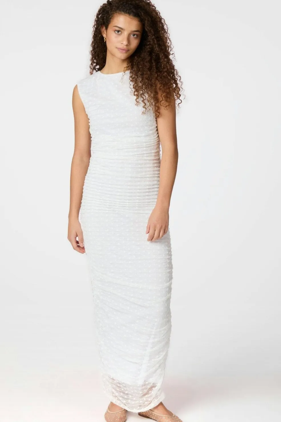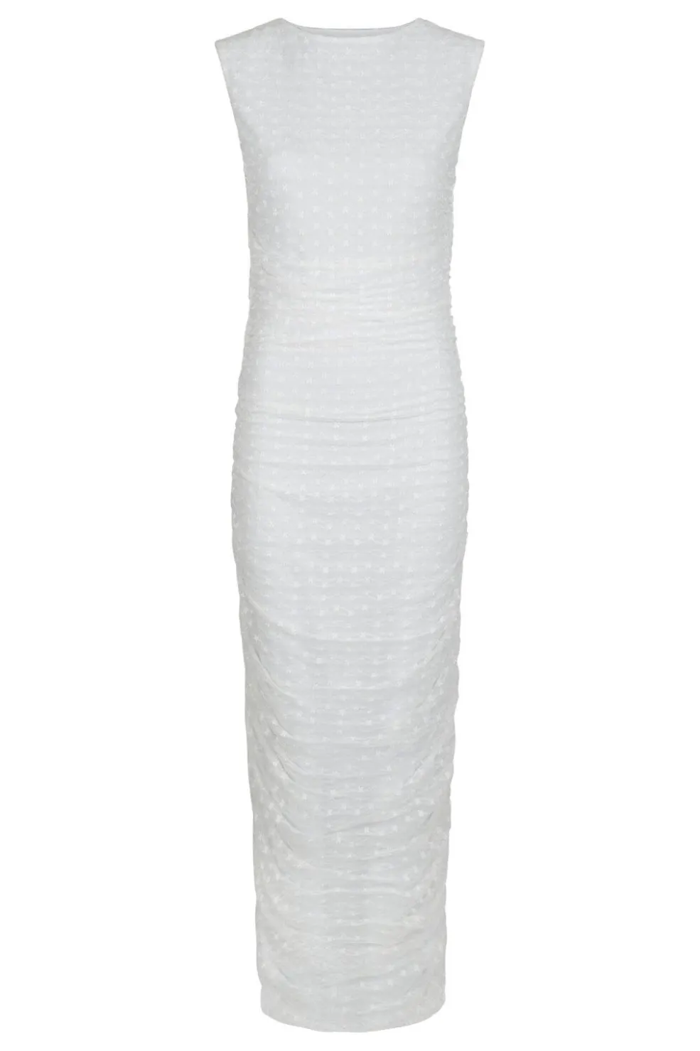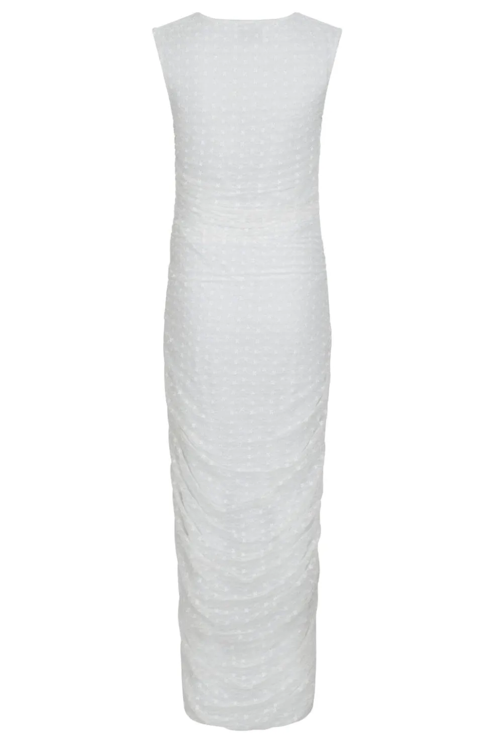 Hvid meshkjole fra Neo Noir med rynker langs siderne. Kjolen har en tætsiddende pasform og ankellængde med blomstrede detaljer i stoffet.