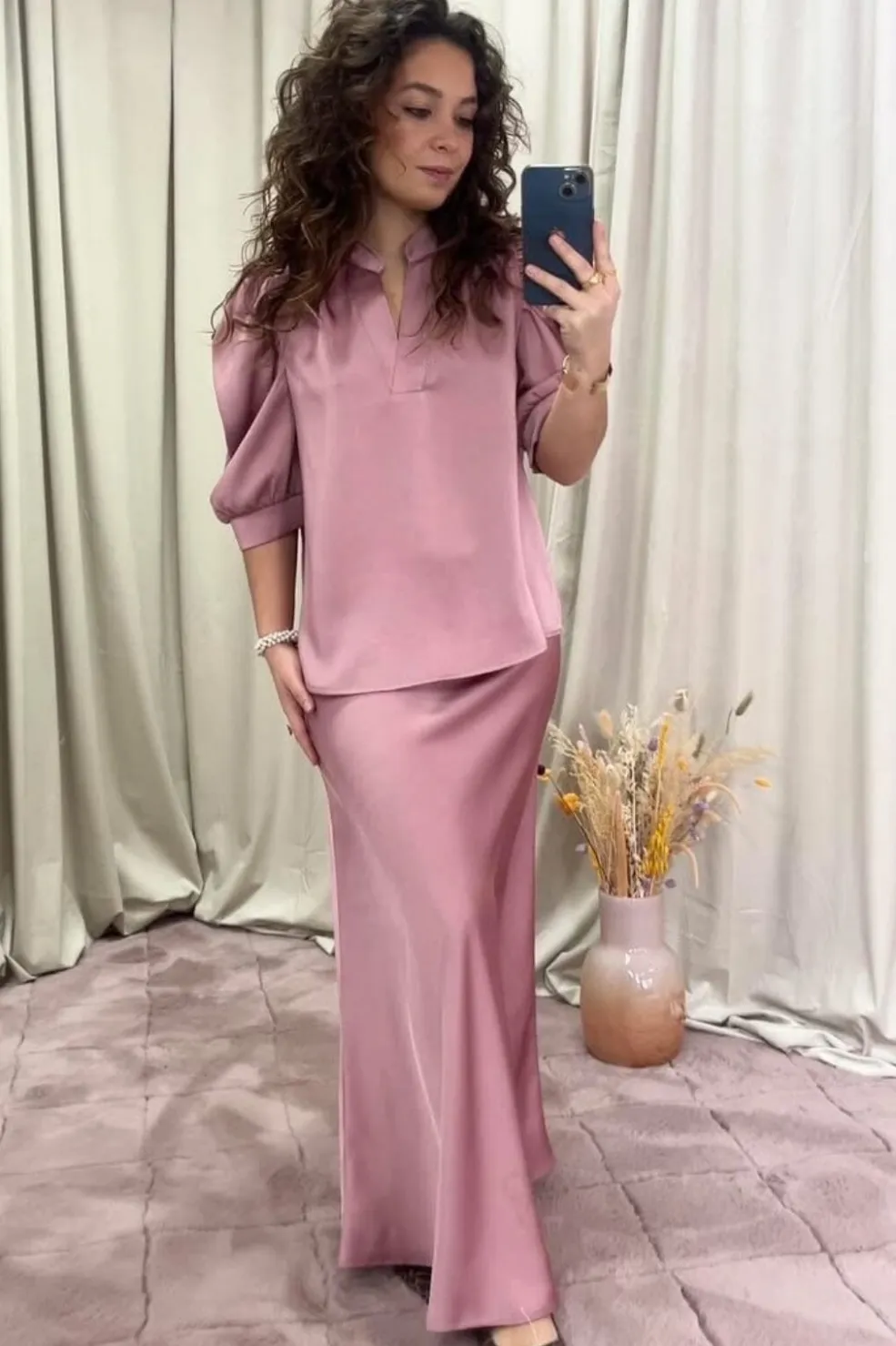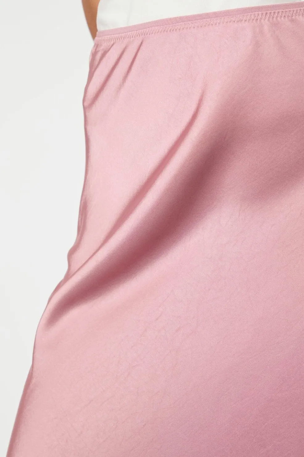 Lang nederdel fra Neo Noir i rosa blødsatin. Den har et skråt snit og elastik i taljen. Nederdelen går til anklerne og er lavet af et blankt materiale.