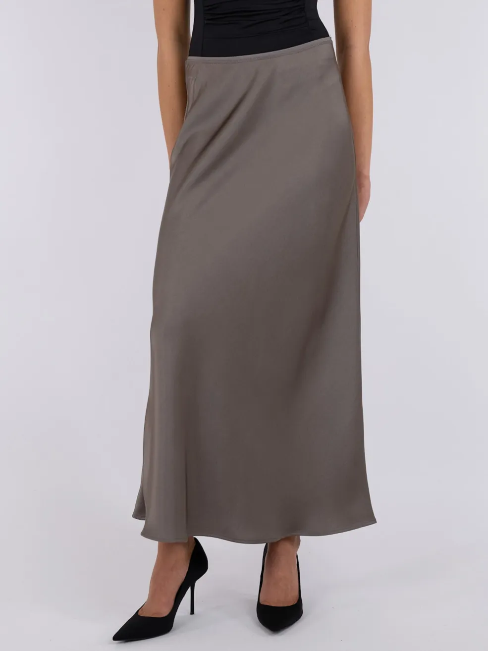 Lang nederdel i varm grå fra Neo Noir. Lavet af blødt satin med skrå skæring og indvendig elastik i taljen.
