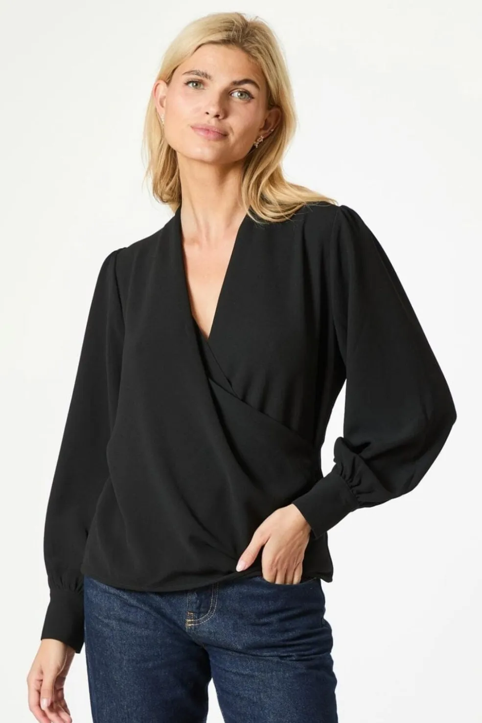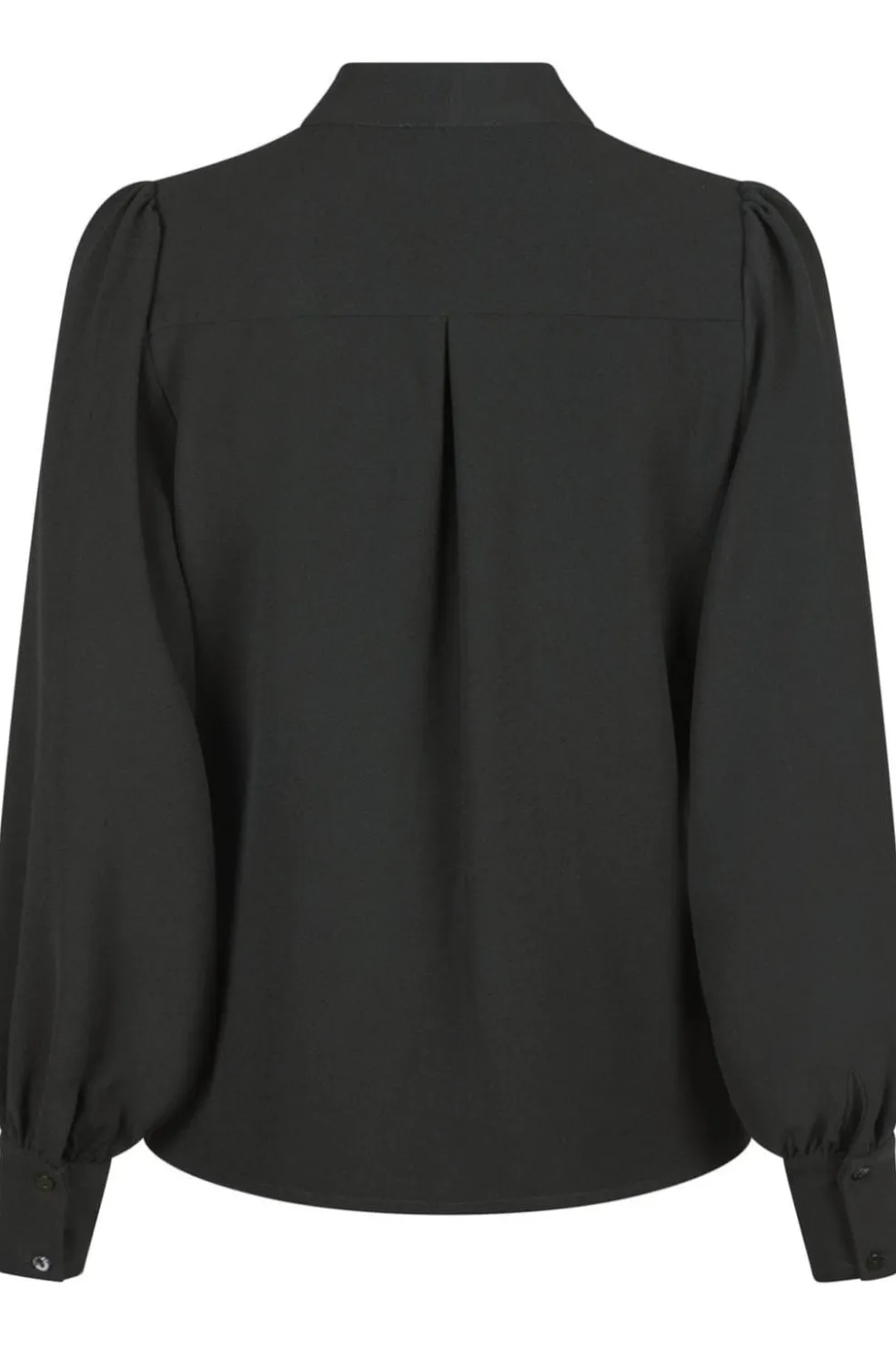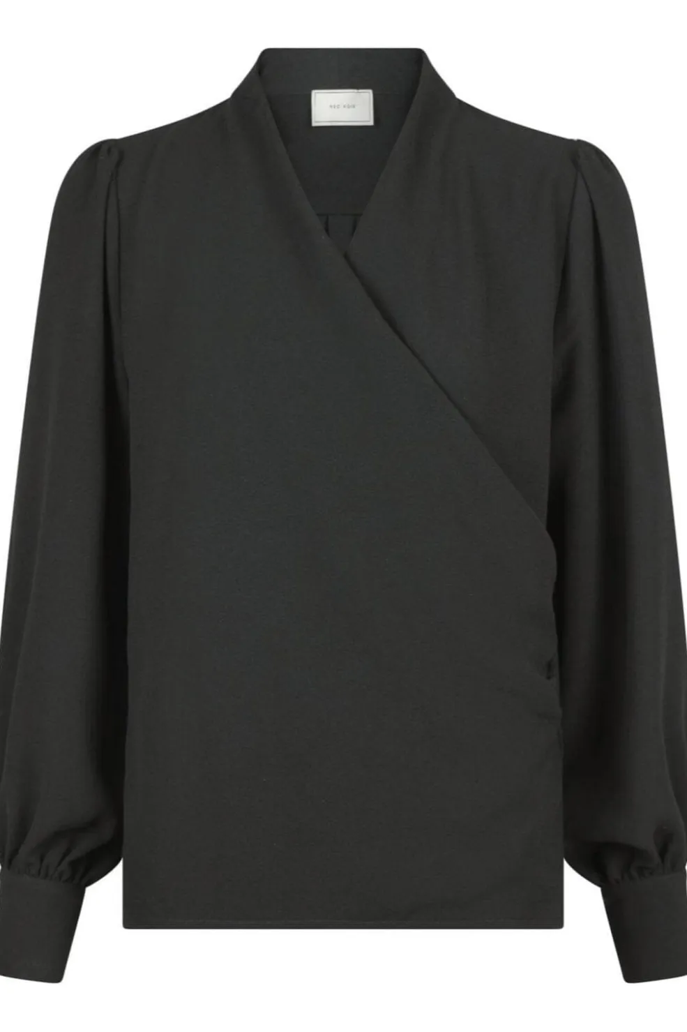 Sort bluse fra Neo Noir med V-hals og omslagsdesign. Blusen har puffede ærmer og en plissé-detalje på ryggen. Den sorte farve og det ensfarvede design gør den nem at style.