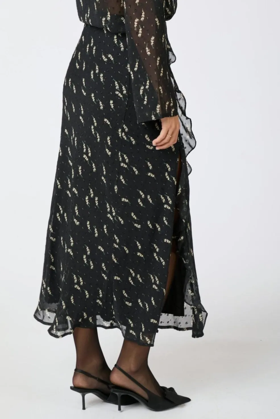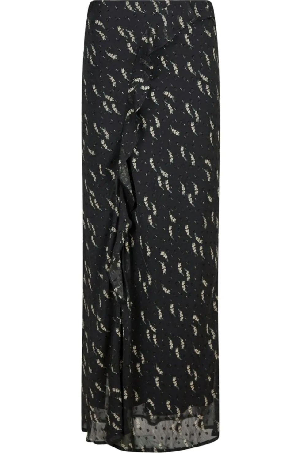 Sort nederdel fra Neo Noir med blomsterprint på hele fladen. Den har en slids i siden og flæsedetaljer foran, som giver et blødt fald i stoffet.