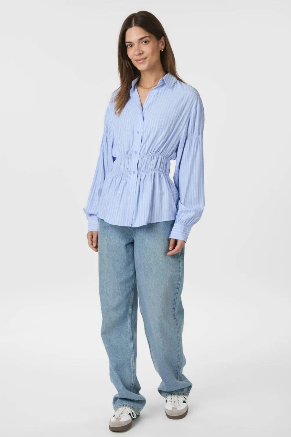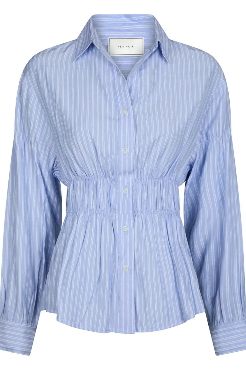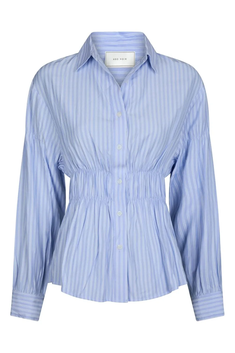 Stribet skjorte med flotte smockdetaljer i talje og skulder, i en lækker stribet kvalitet. Modellen er 176 cm og er iført størrelse 36.