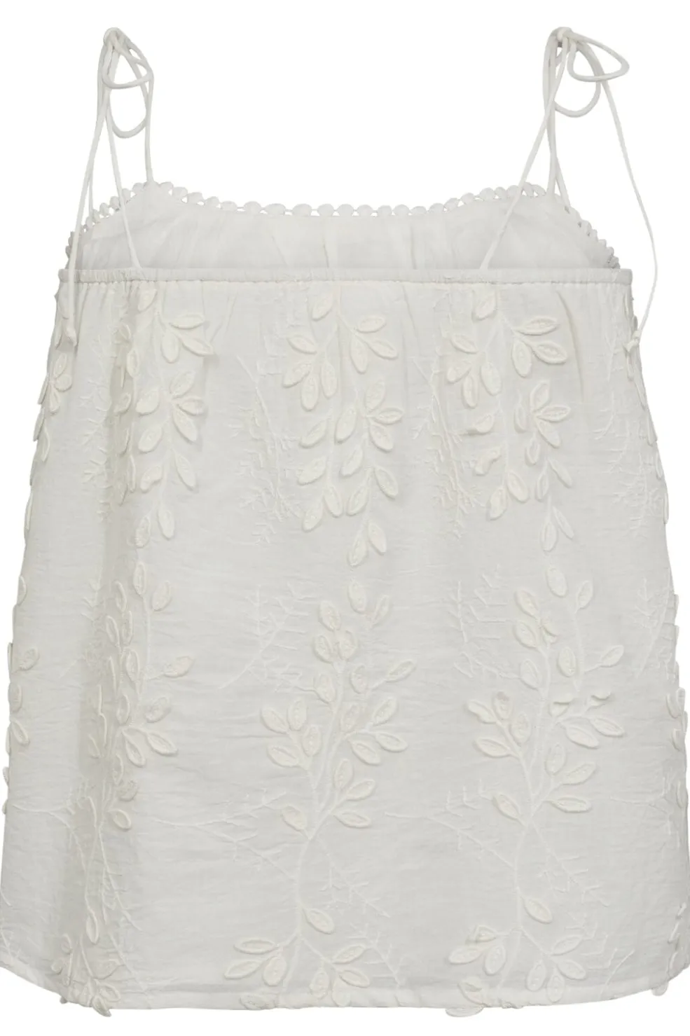 Ærmeløs top fra Co´Couture i off-white med broderet bladmønster. Toppen har tynde bindebånd ved skuldrene og en rund halsudskæring.