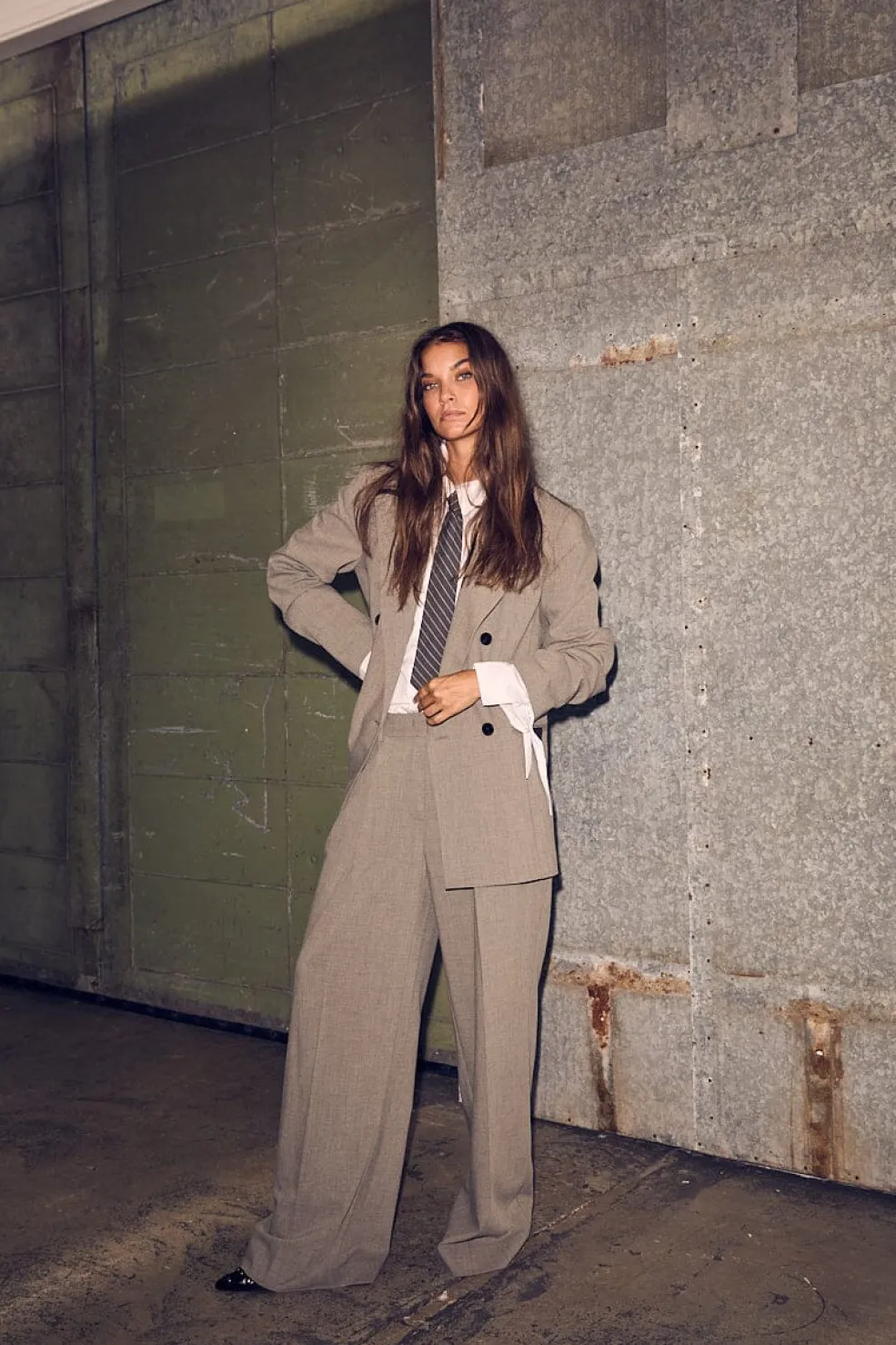 Bukser fra Haute L’Amitié i beige melangé. Høj talje, gulvlængde og løs pasform giver et klassisk look med læg foran.