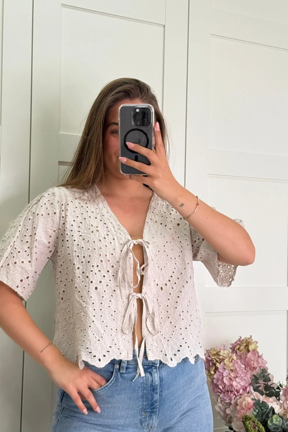 Beige bluse fra A-bee med hulmønster og blondedetaljer. Blusen har en V-udskæring med snørebånd og korte ærmer, hvilket gør den velegnet til sommerens varme dage.