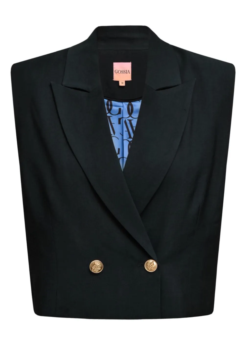 Mørkeblå vest fra Gossia med dobbeltradet front og guldknapper. Den har skjortekrave og en plissé-detalje på ryggen. Blå foring med tekst på indersiden.