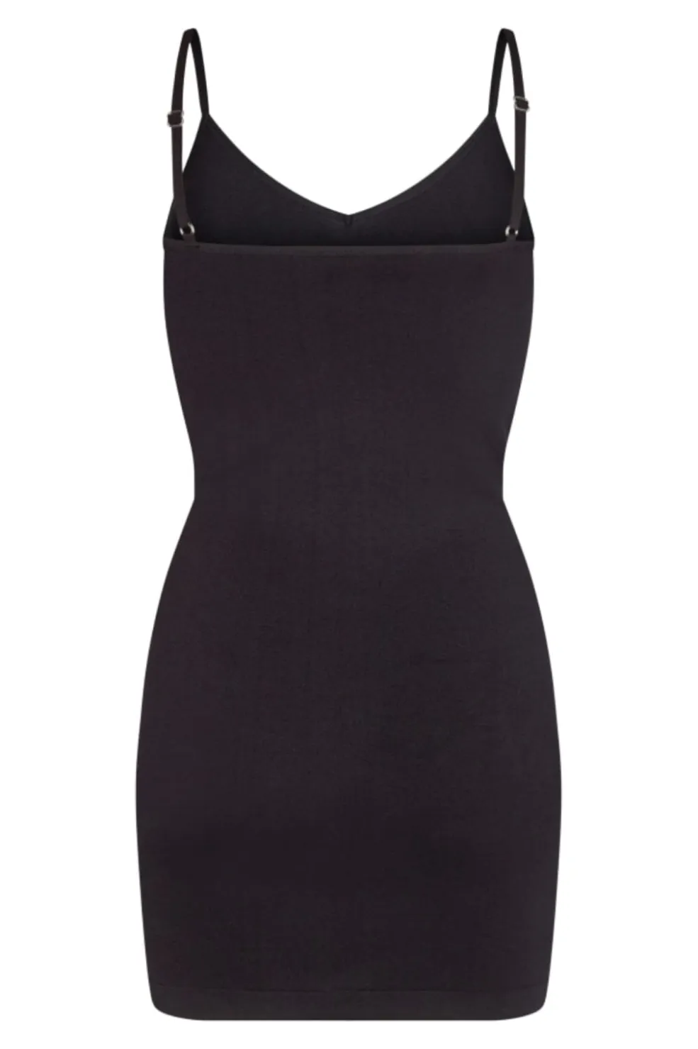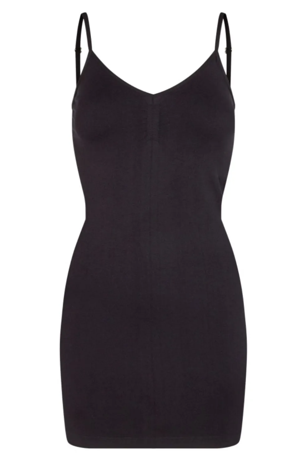 Sort slipdress fra Liberte med spaghetti-stropper og V-udskæring. Kjolen har en tætsiddende pasform og går til midt på låret.