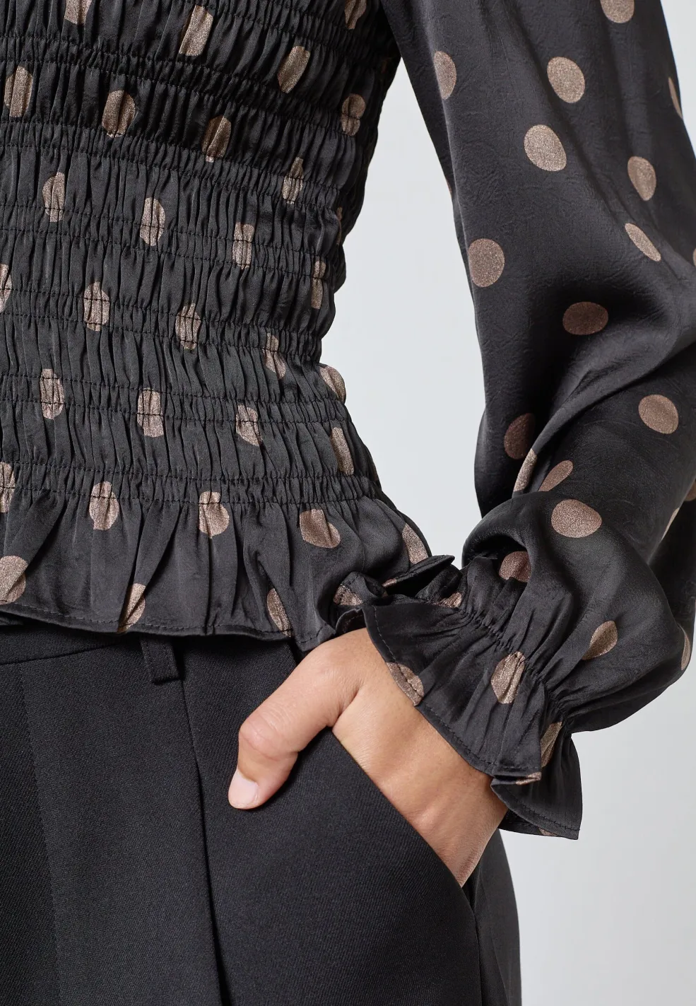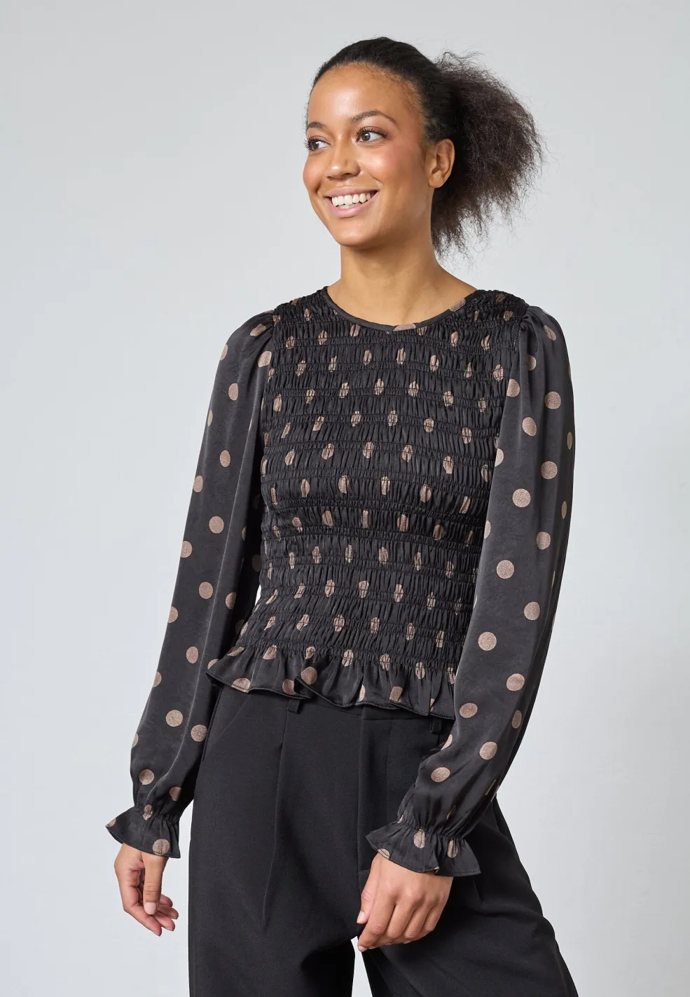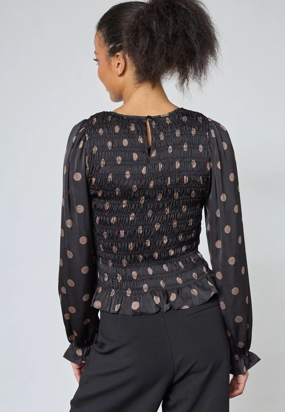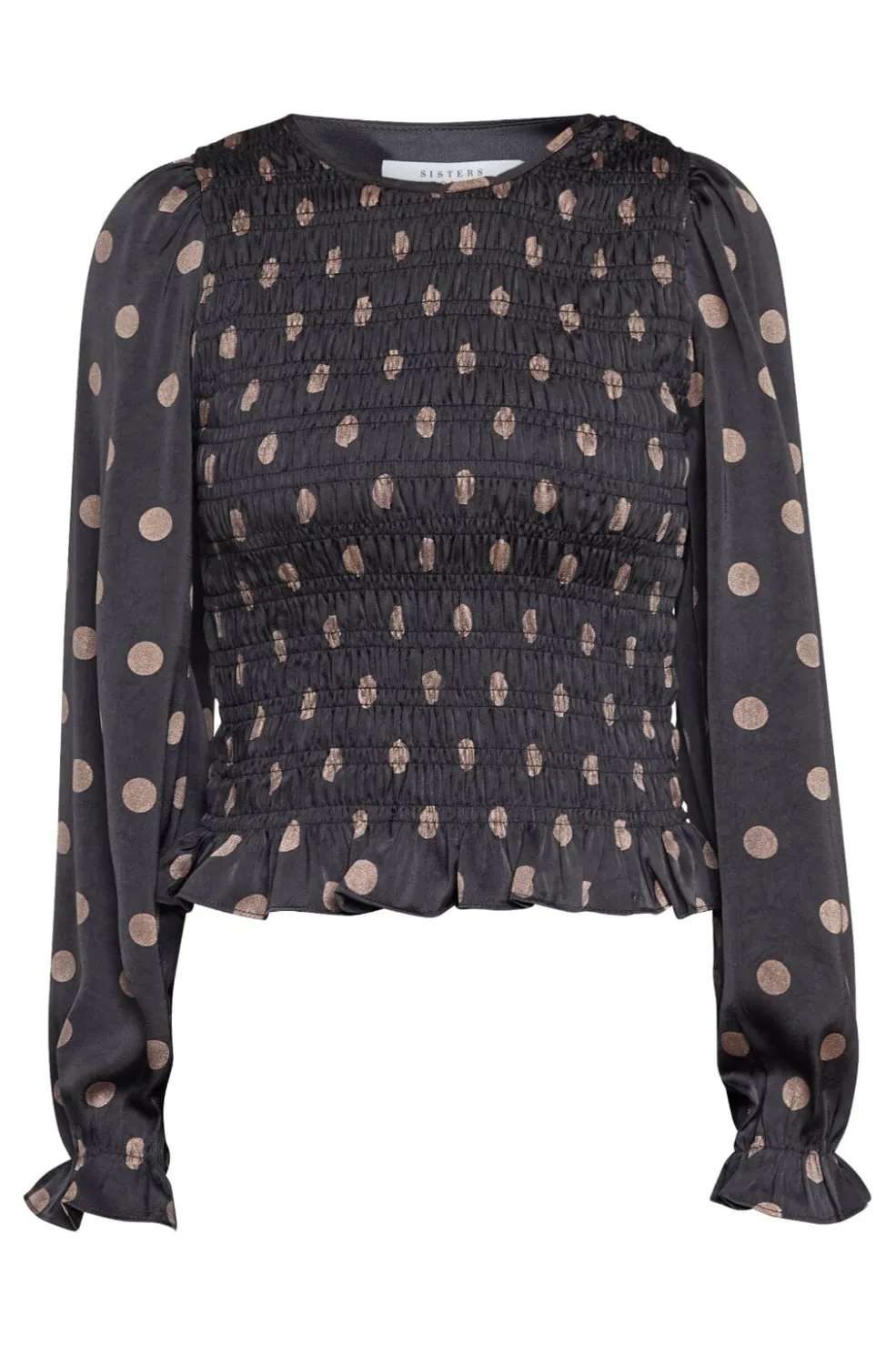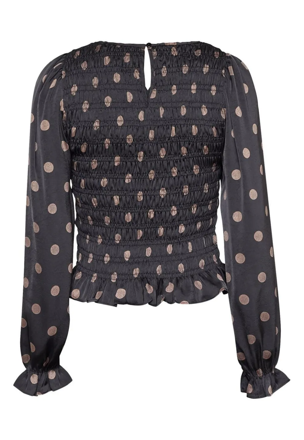 Sort bluse fra Sisters Point med polkaprikker i mat satin. Blusen har rund hals og slim fit-pasform, og den passer til både hverdagen og festlige lejligheder.