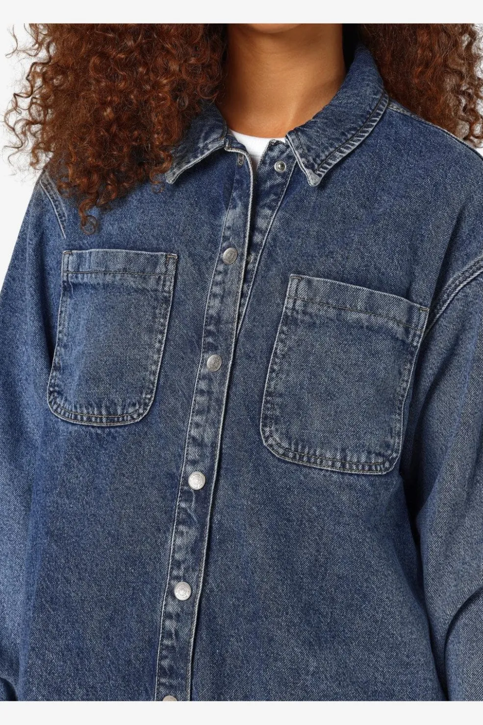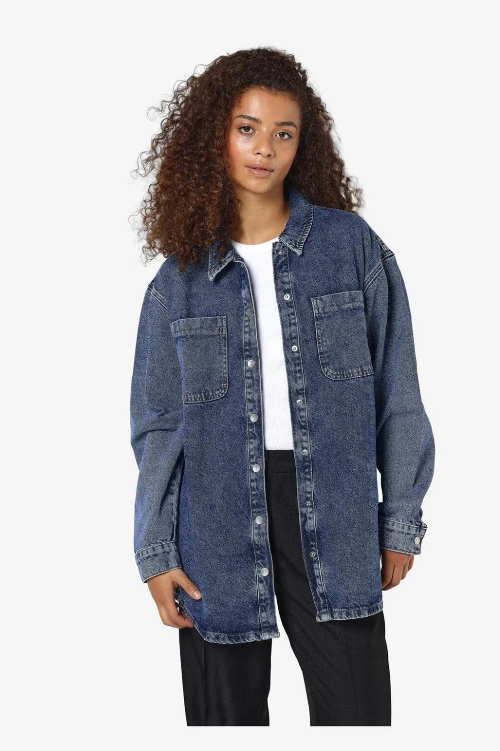 Denimjakke fra Noisy May i mellemblå bomuld med acid wash-effekt. Jakken har en spredt krave, lange ærmer og knaplukning langs fronten.