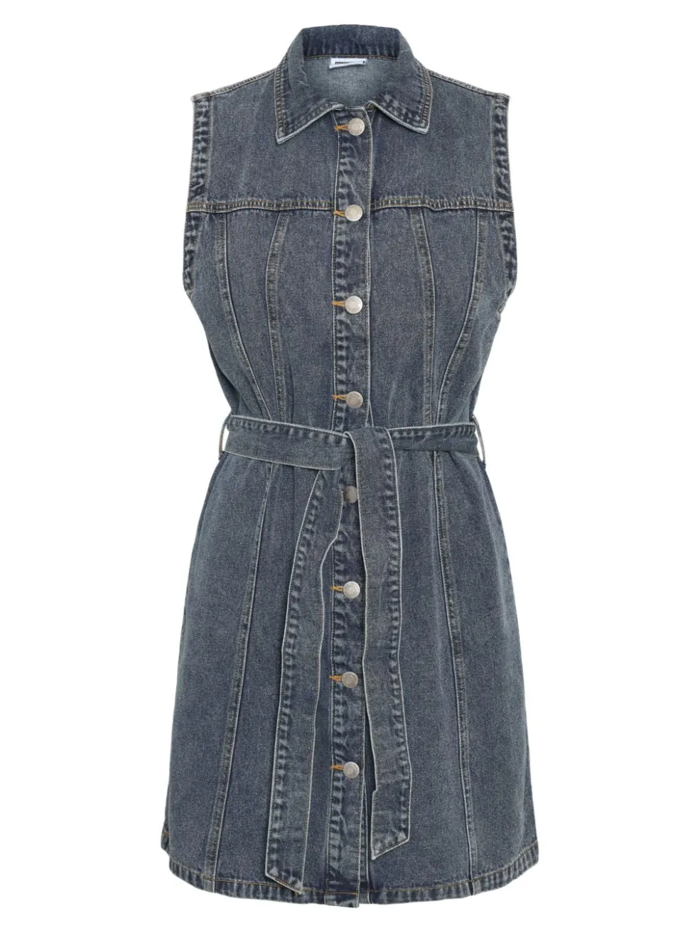 Denimkjole fra Noisy May i mellemblå denim. Kjolen er ærmeløs med skjortekrave og bindebånd i taljen. Regular fit og lårlængde giver bevægelsesfrihed.
