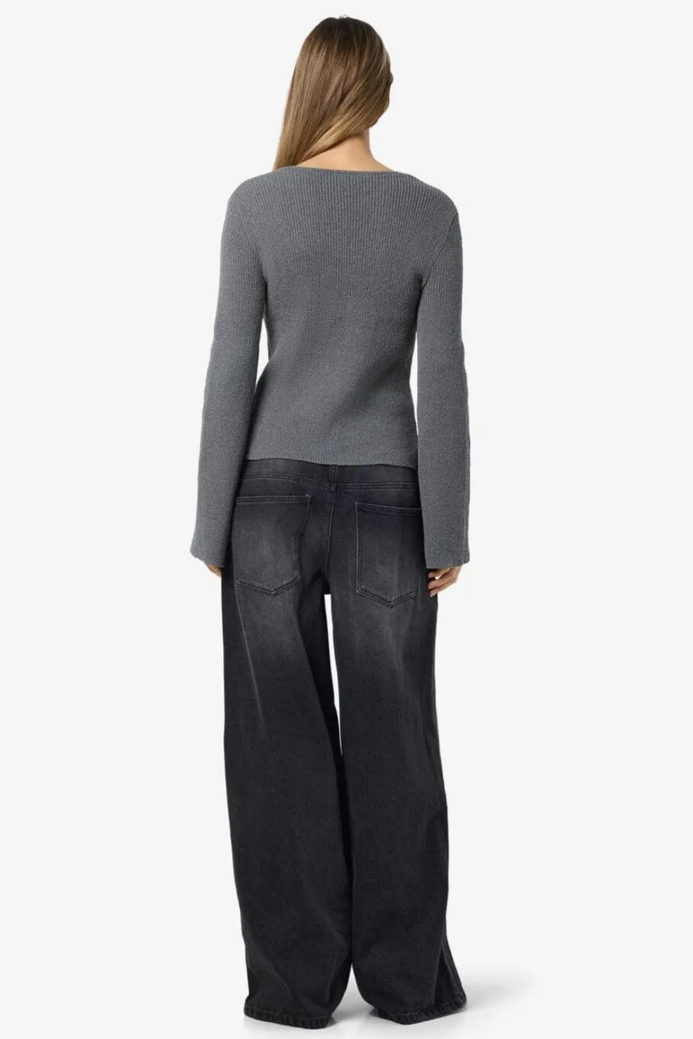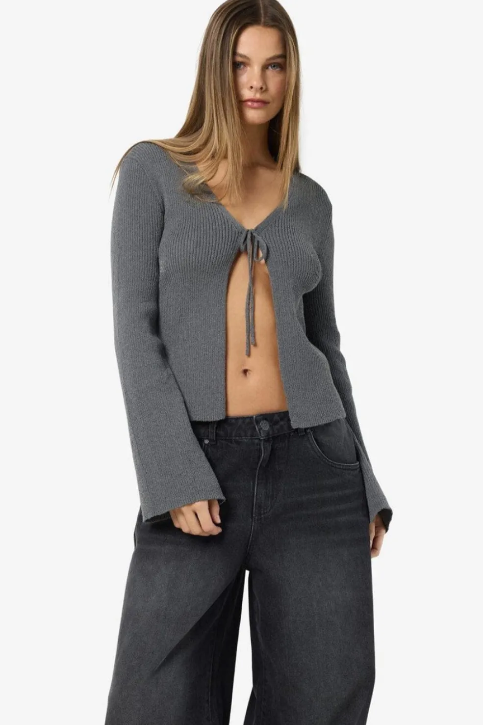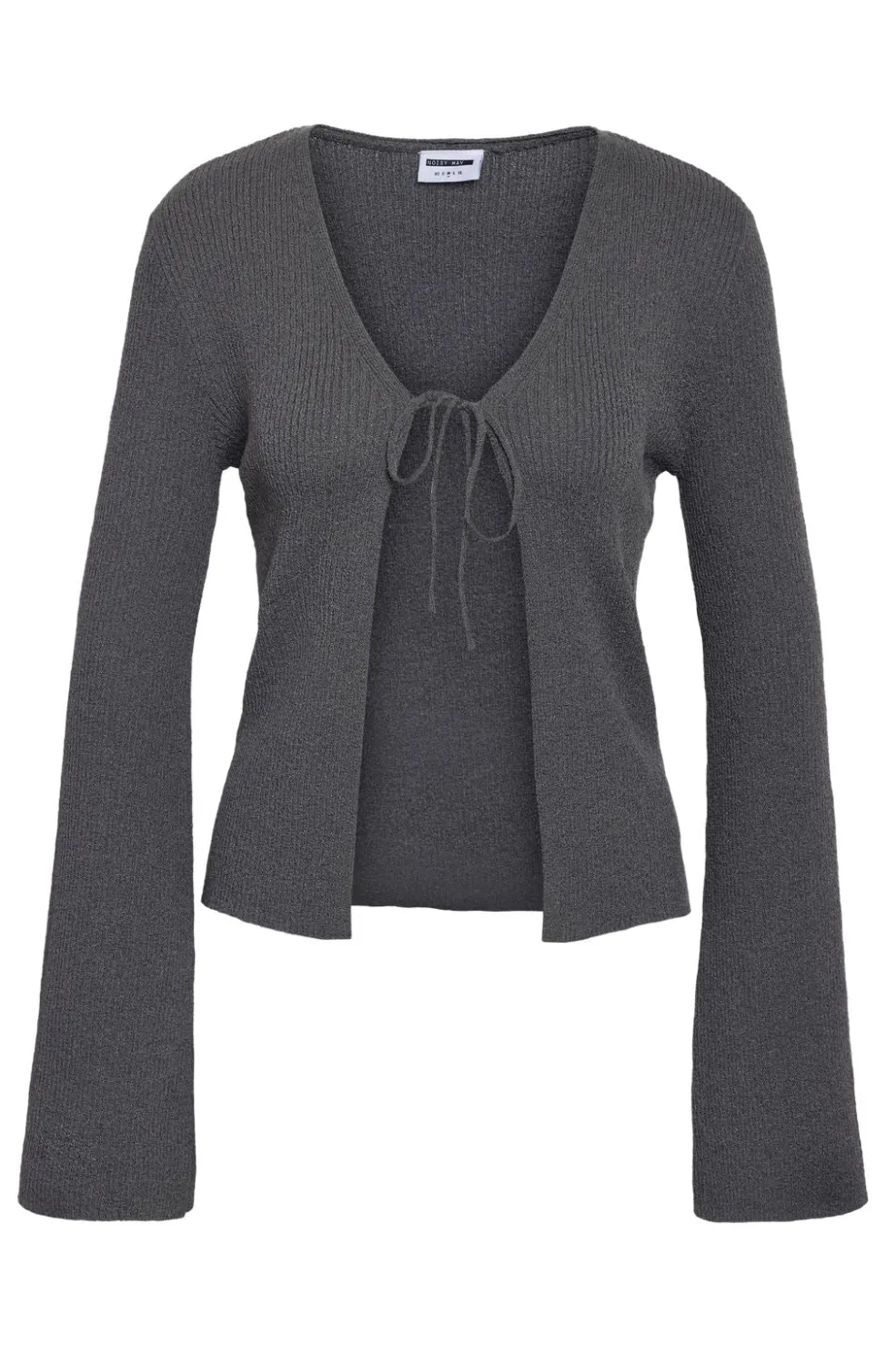 Strikket cardigan fra Noisy May i kulgrå. Cardiganen har bindebånd foran og en ribbet tekstur, der giver den et struktureret udtryk.