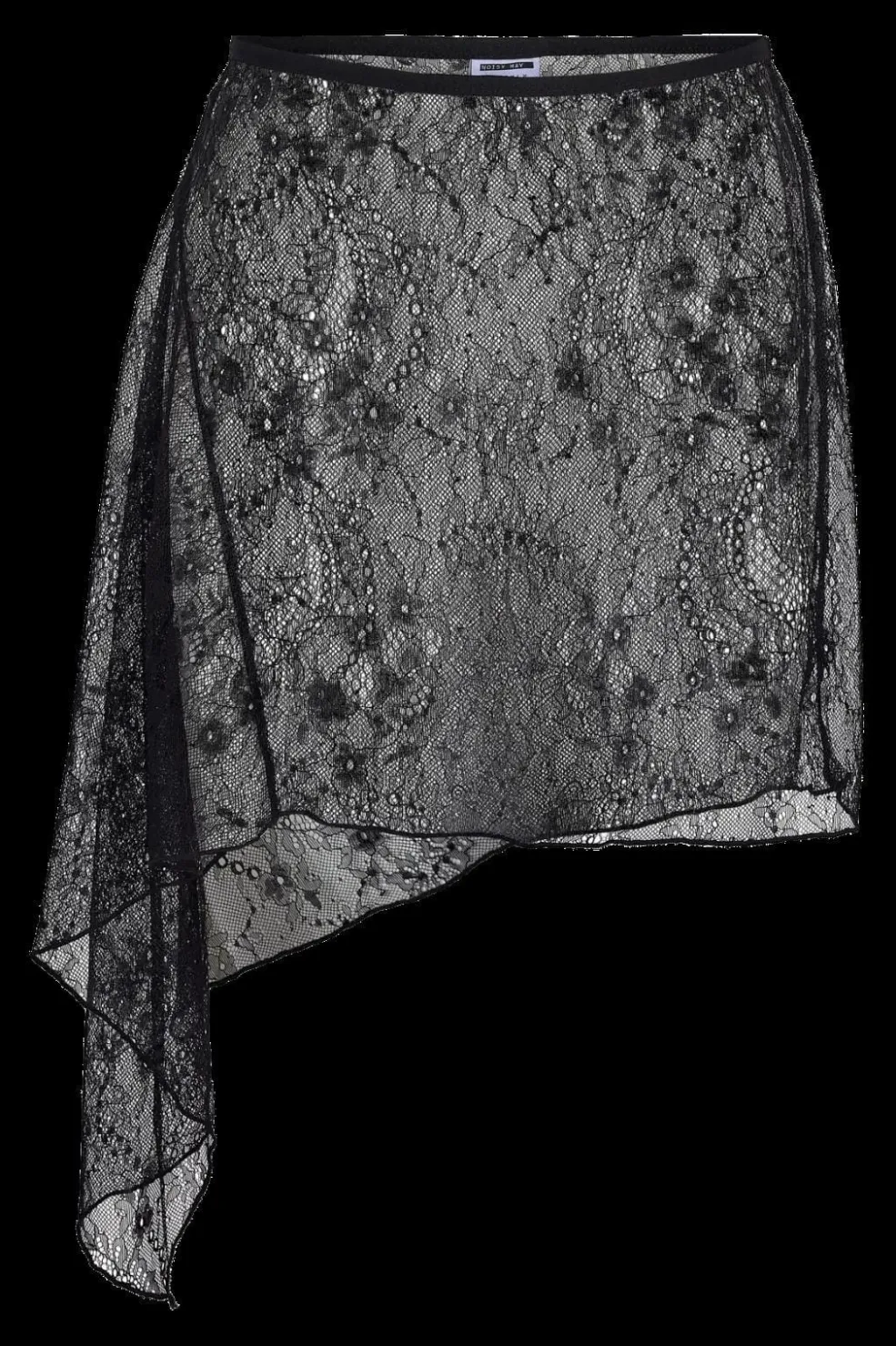 Sort blonde-nederdel fra Noisy May, designet til at bæres over jeans eller bukser. Nederdelen har et floralt blondemønster og en asymmetrisk kant.