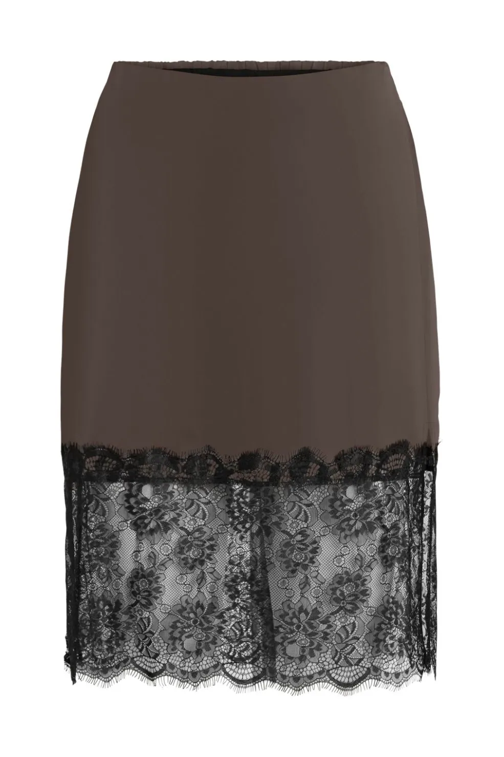 Satinnederdel fra Noisy May i chokoladebrun farve med sort blondekant nederst. Det lagdelte design kombinerer fast stof med blonder.