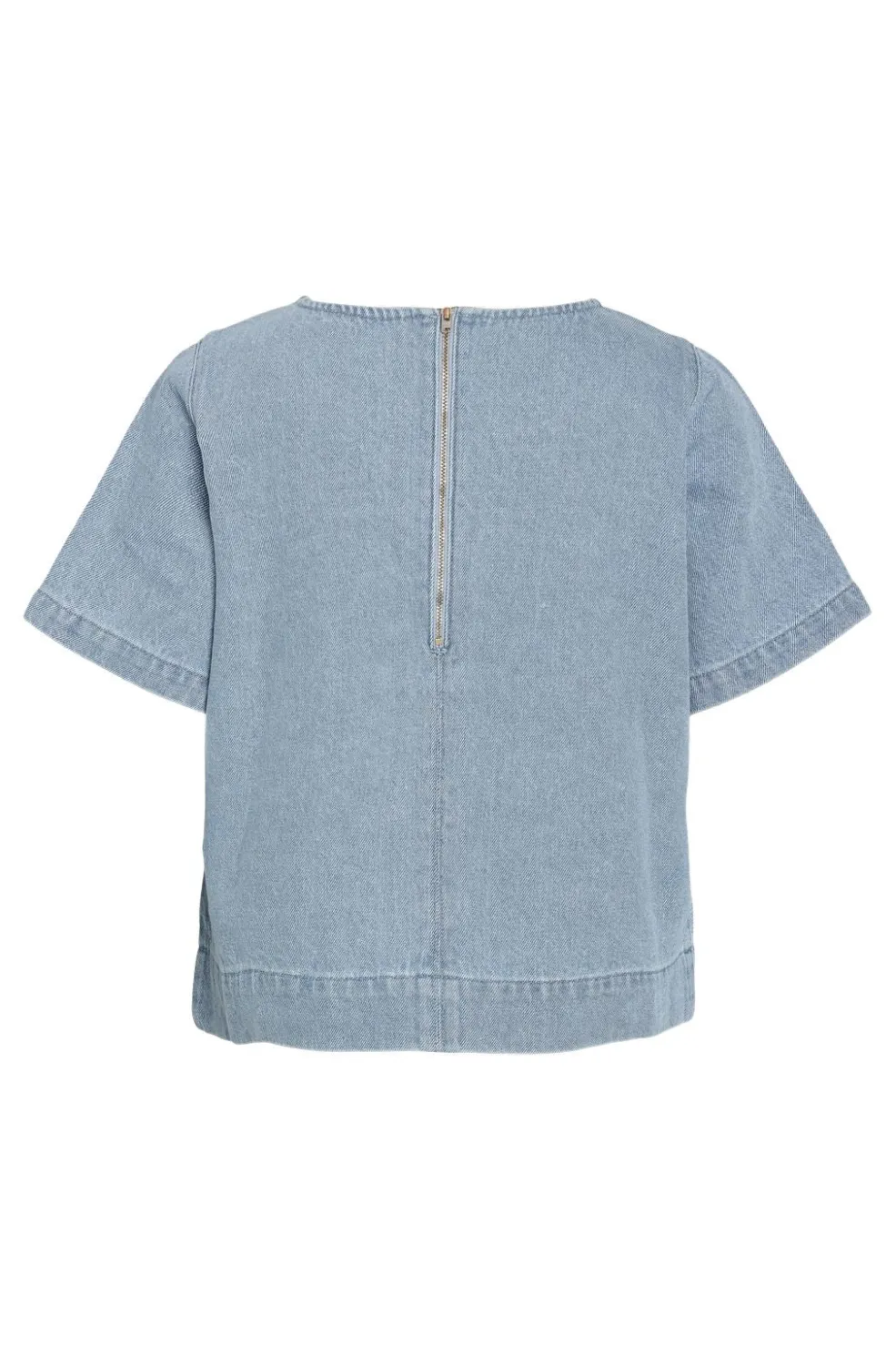 Lyseblå denimskjorte fra Noisy May med skinnende detaljer. Slim fit-designet fremhæver figuren. Den passer til både hverdag og fest.