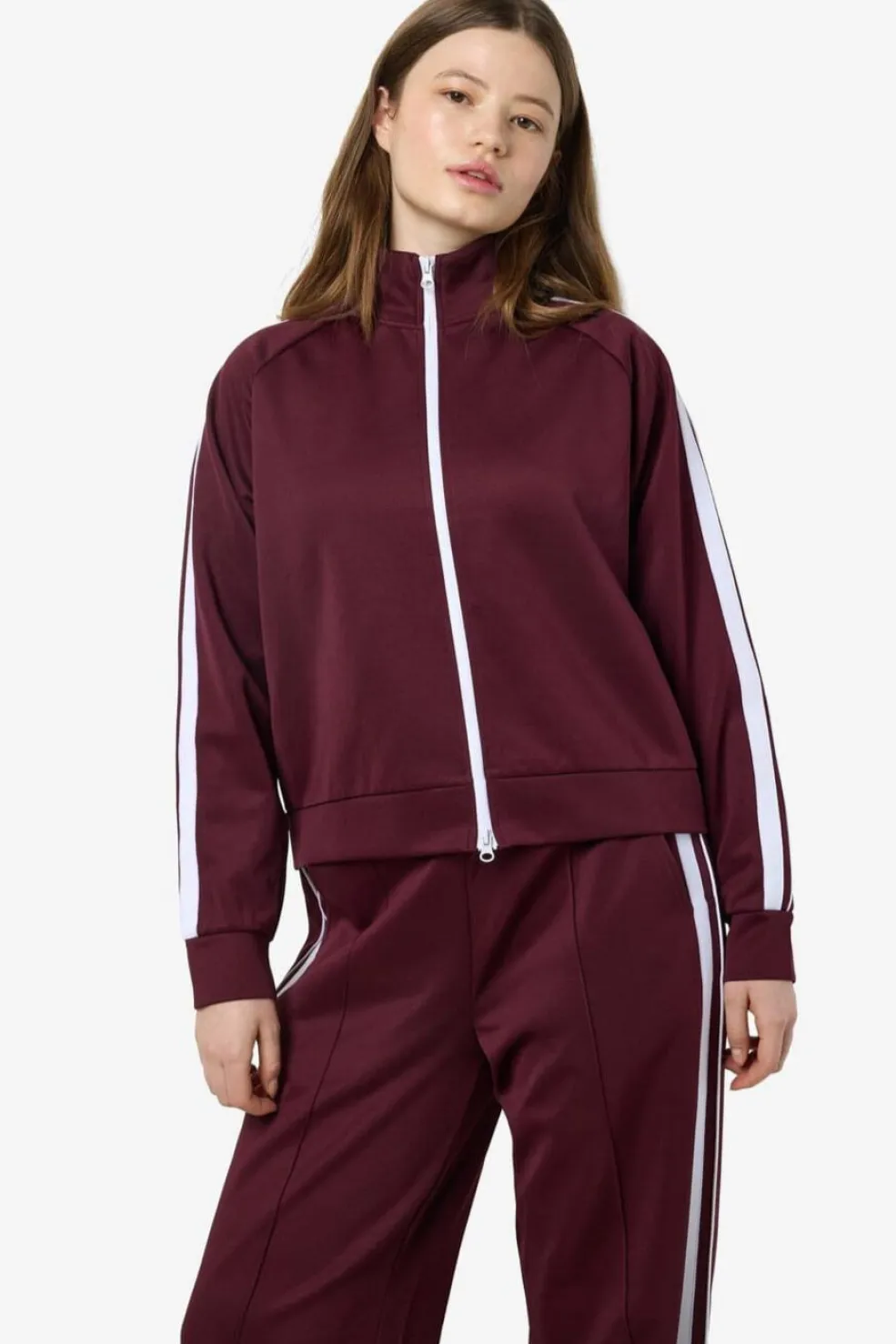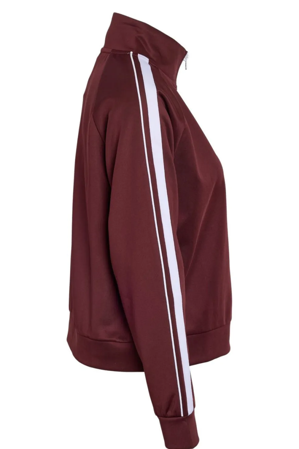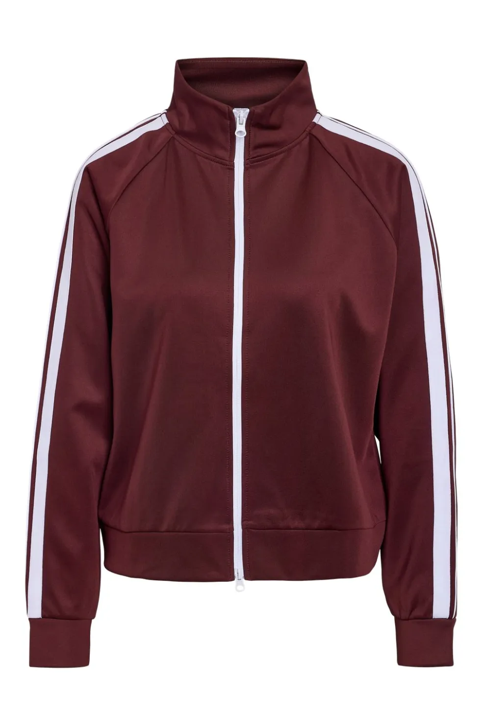 En stribet jakke fra Noisy May i mørk vinrød med hvide striber langs ærmerne. Jakken har høj hals og lynlås foran.