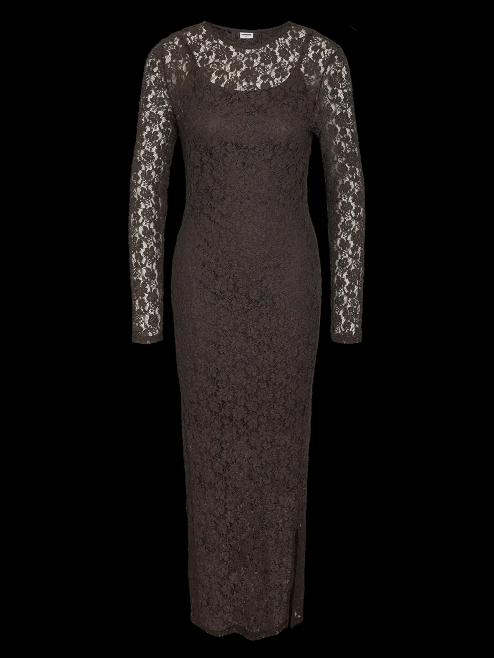 En lang blondekjole fra Noisy May i chokoladebrun farve. Kjolen har et blomstret blondemønster og er lavet til festlige og formelle lejligheder.