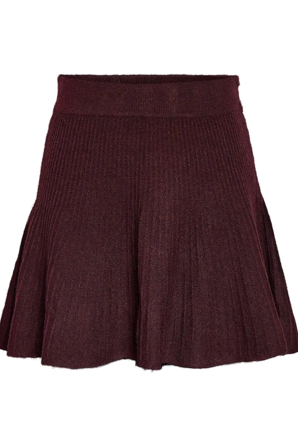 Plisseret strikket nederdel fra Noisy May i en dyb vinrød farve. Nederdelen har elastik i taljen og lodrette folder.