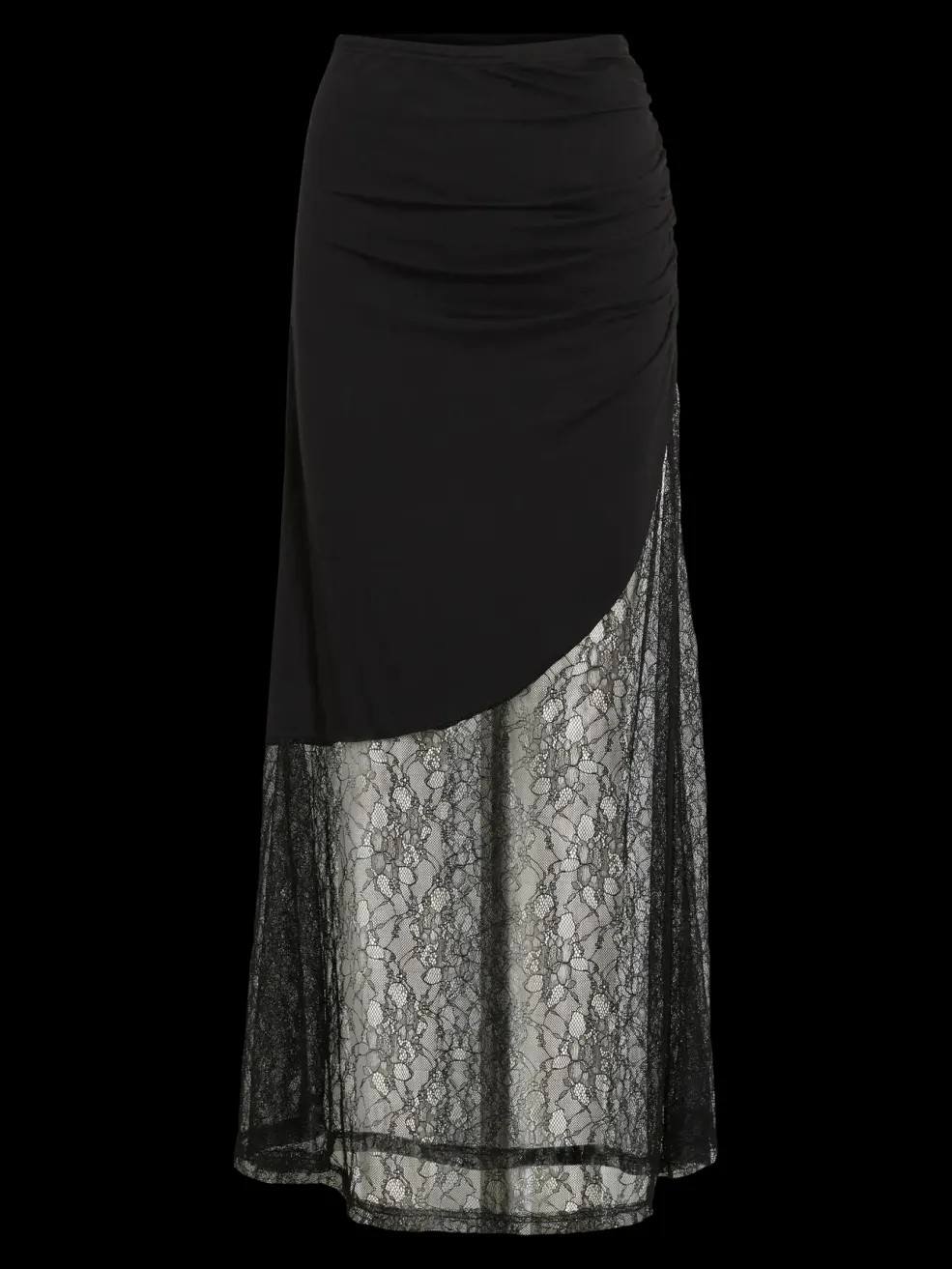 Sort nederdel fra Noisy May med blonder-detaljer. Nederdelen har en tætsiddende pasform i toppen og gennemsigtig blonde fra knæ til ankel.