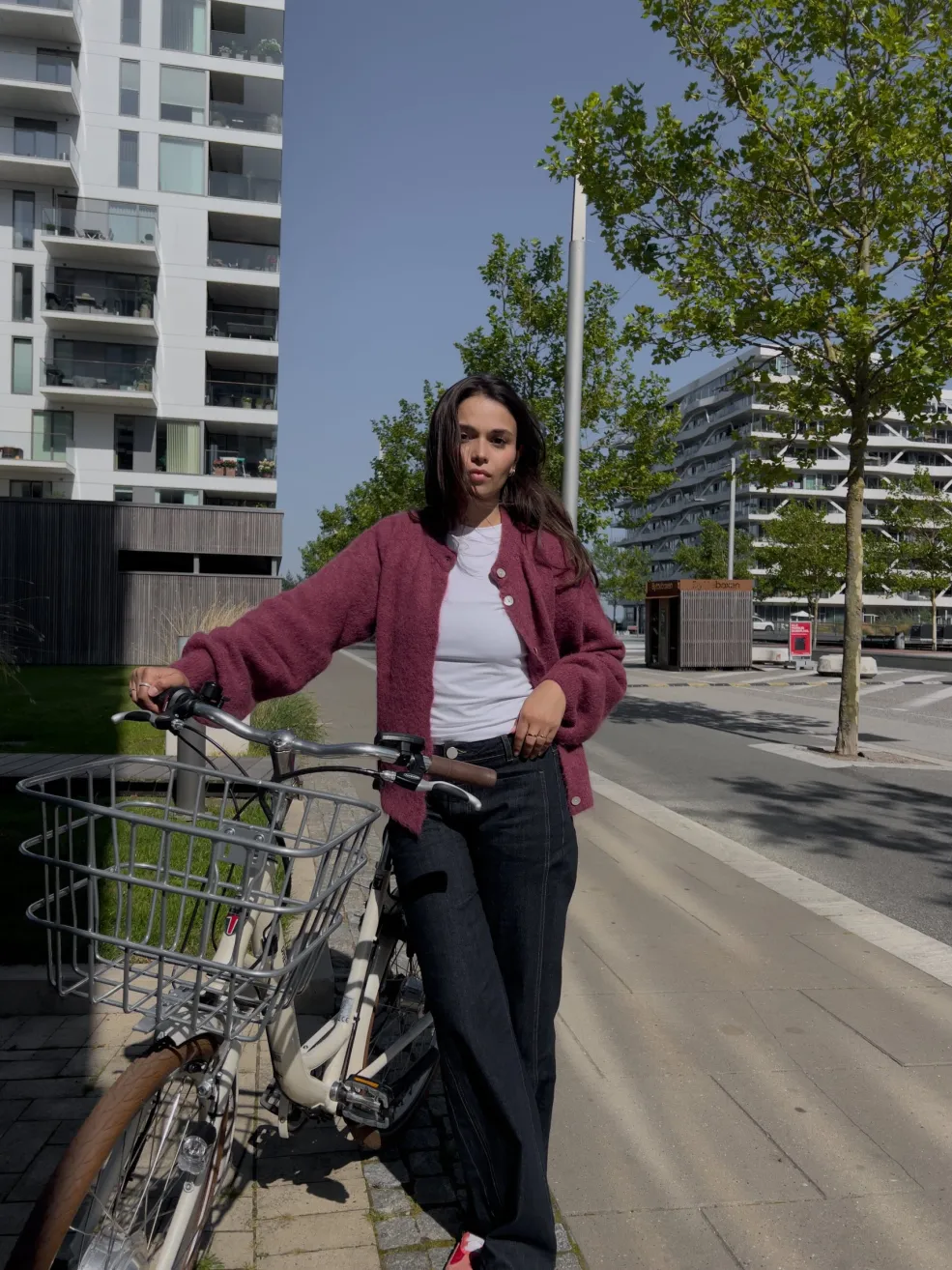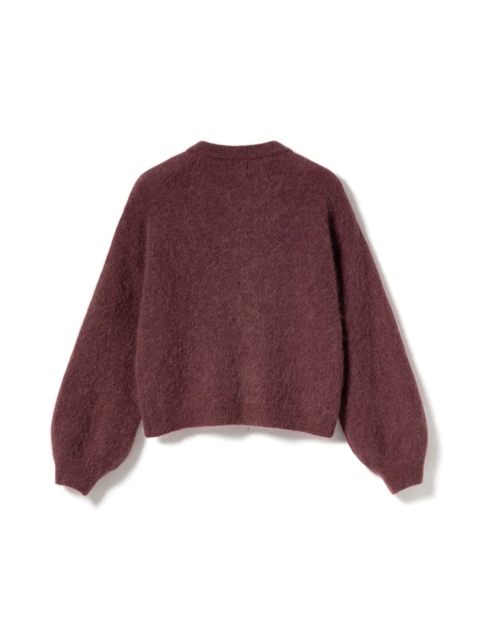 En strikket cardigan fra Noella i en varm rustfarve. Cardiganen har perledetaljer, der giver et dekorativt udtryk.